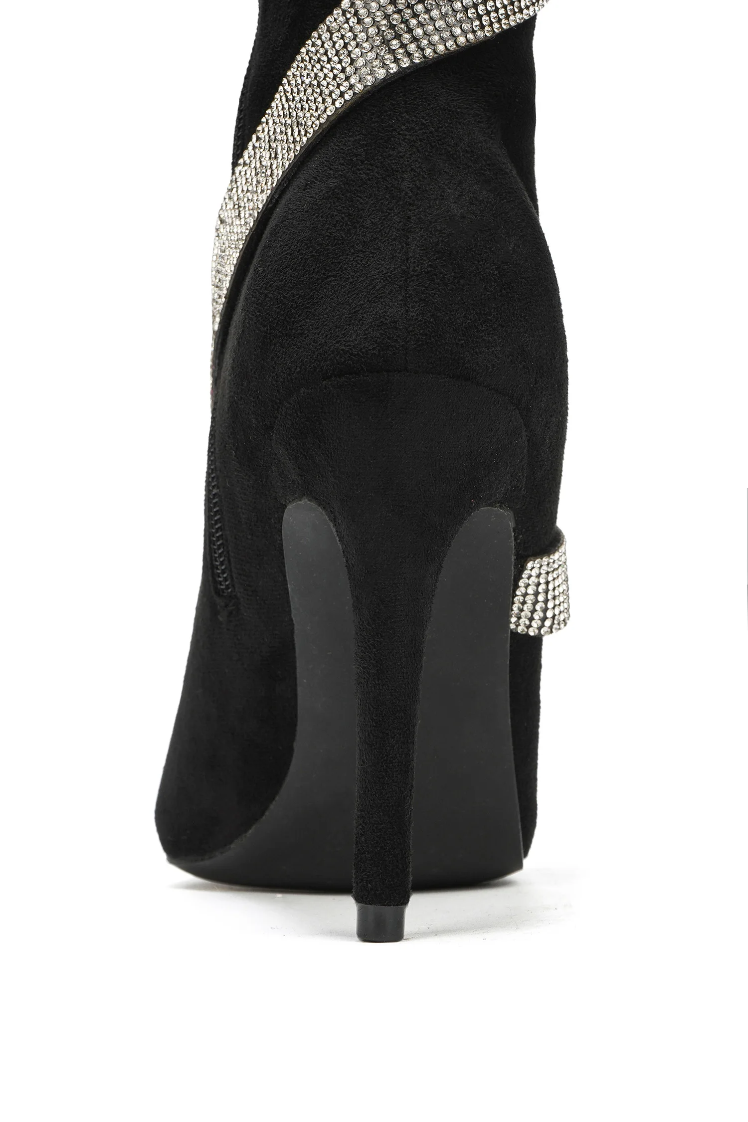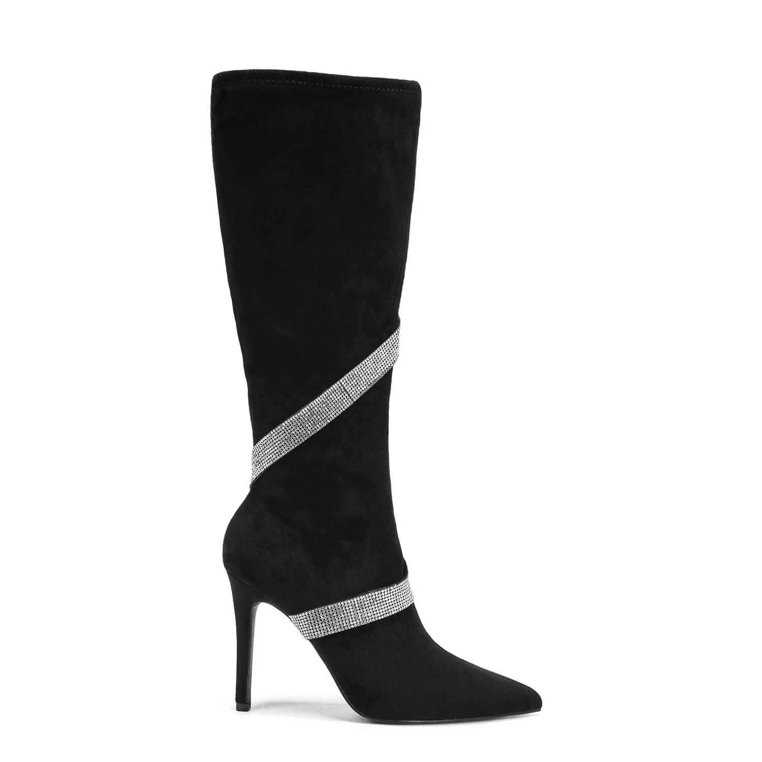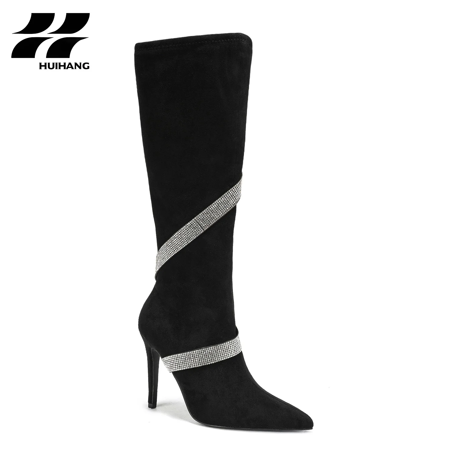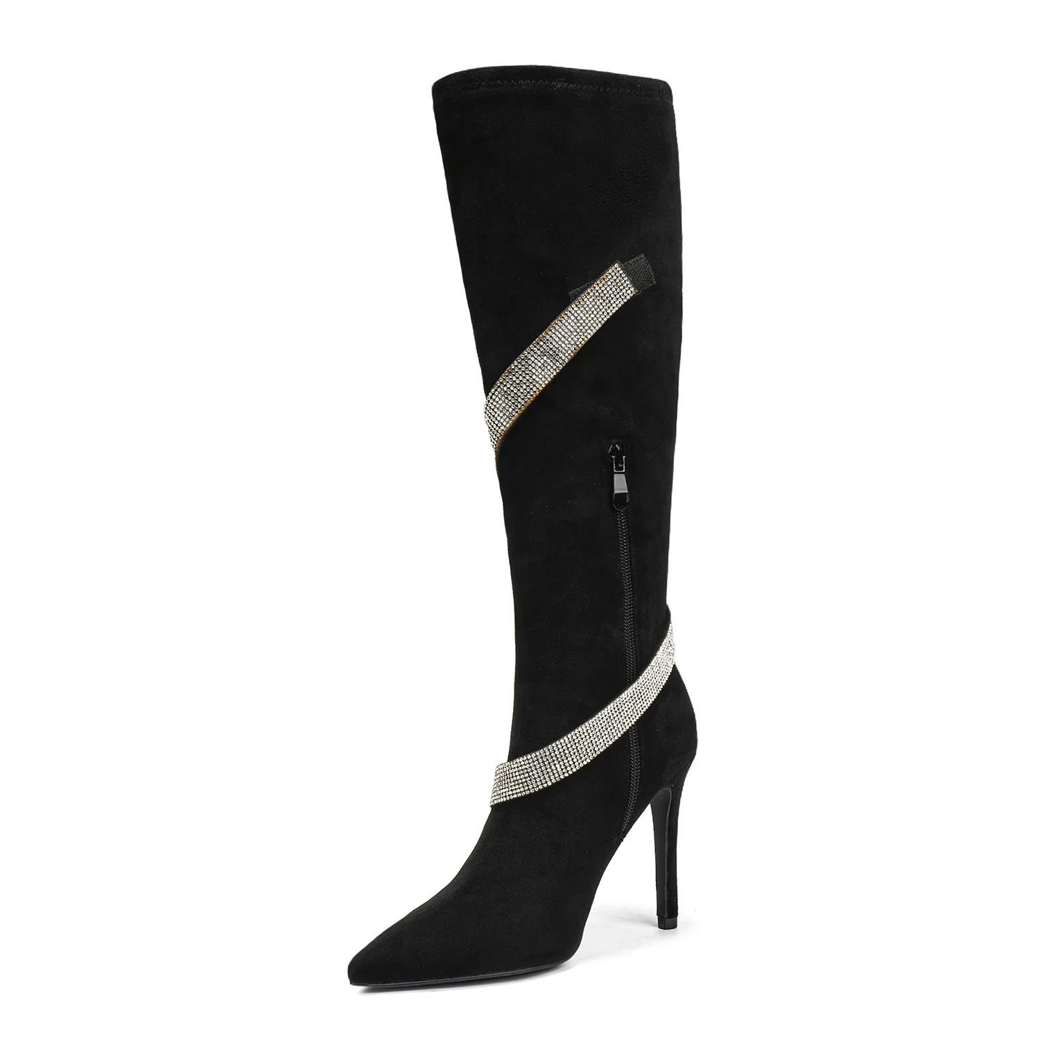 Women's Trendy Winter Stiletto Boots Suede Knee-High Pointed Toe Rhinestone Straps Height Increasing for Fall/Winter Party