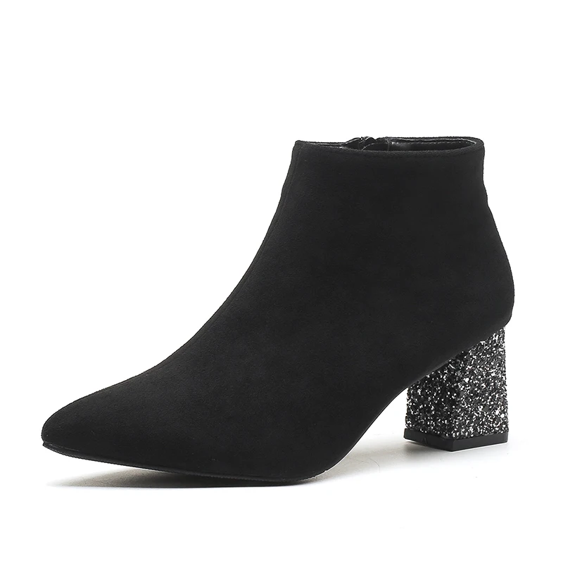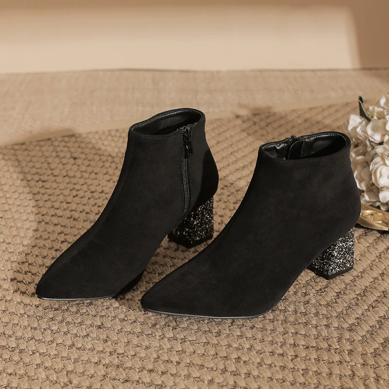 Women's Pointed Toe Ankle Boots Suede Block Heel Glitter Party Shoes Comfortable Warm Autumn Winter Boots