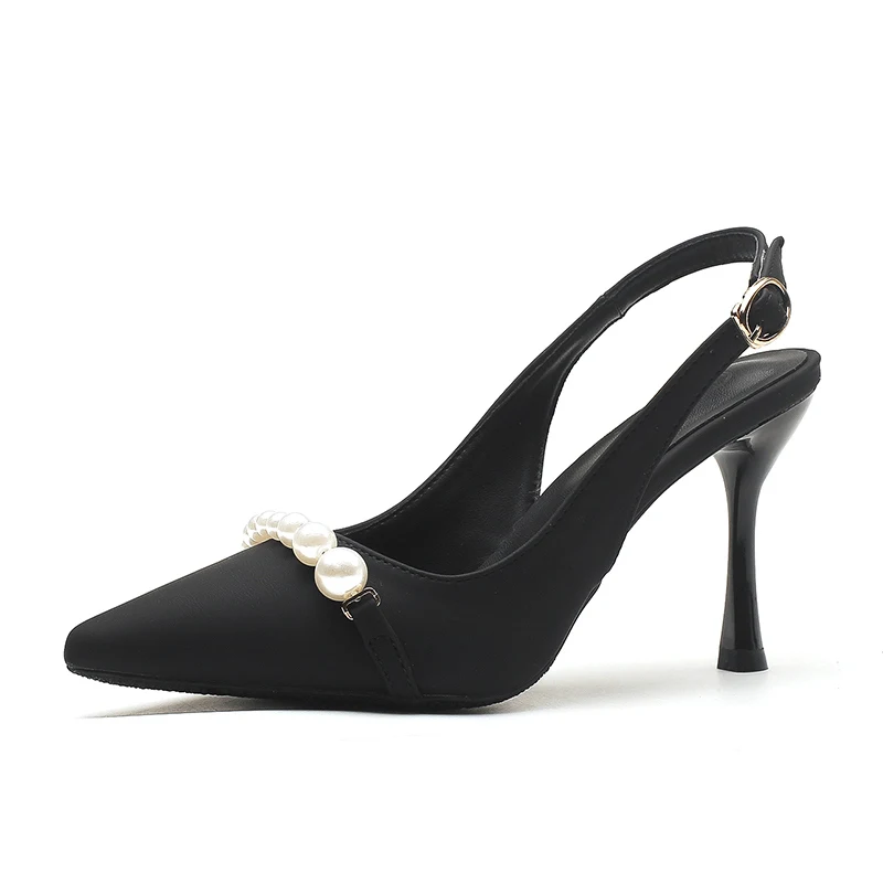 Elegant Black Microfiber Pointed Toe Stiletto Heel Sandals with Pearl Accent & Back Strap, 5CM/7CM/8.5CM Heel for Summer