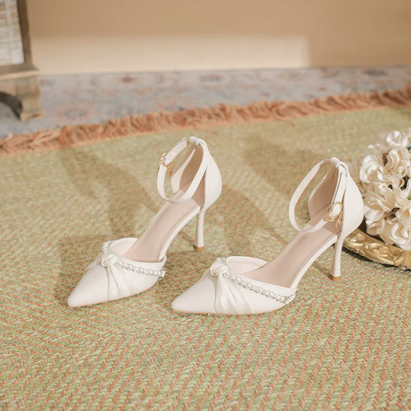 Elegant White Microfiber Pointed Toe Stiletto Heel Sandals with Pearl & Rhinestone Decor, 8.5CM Heel for Summer