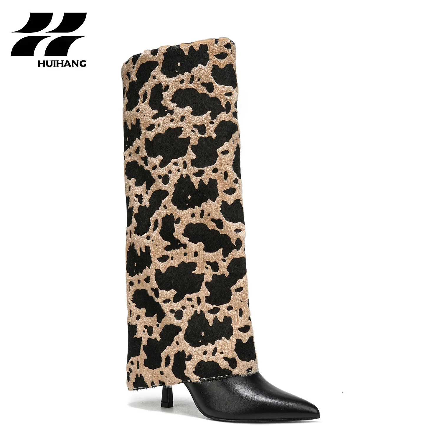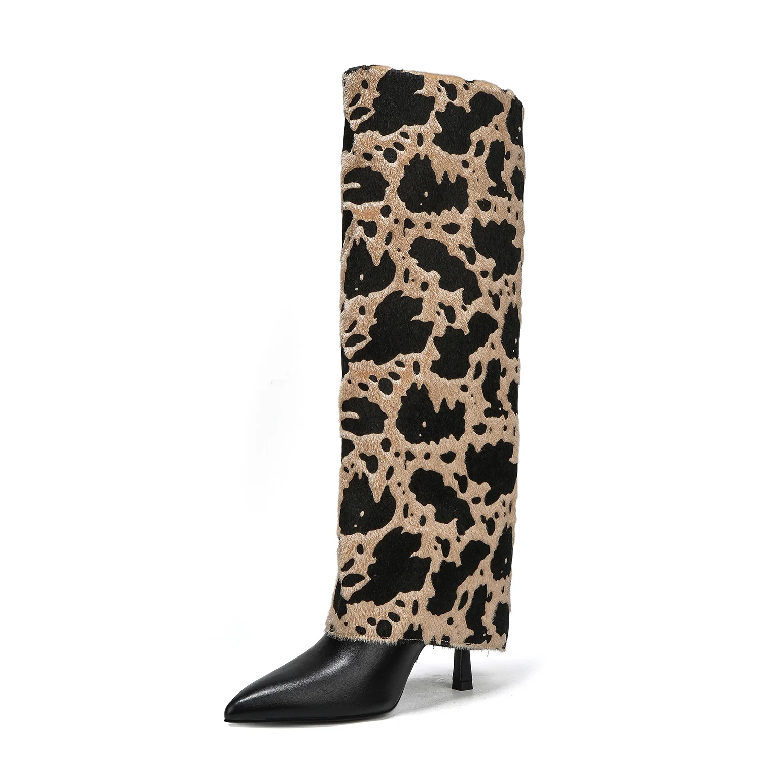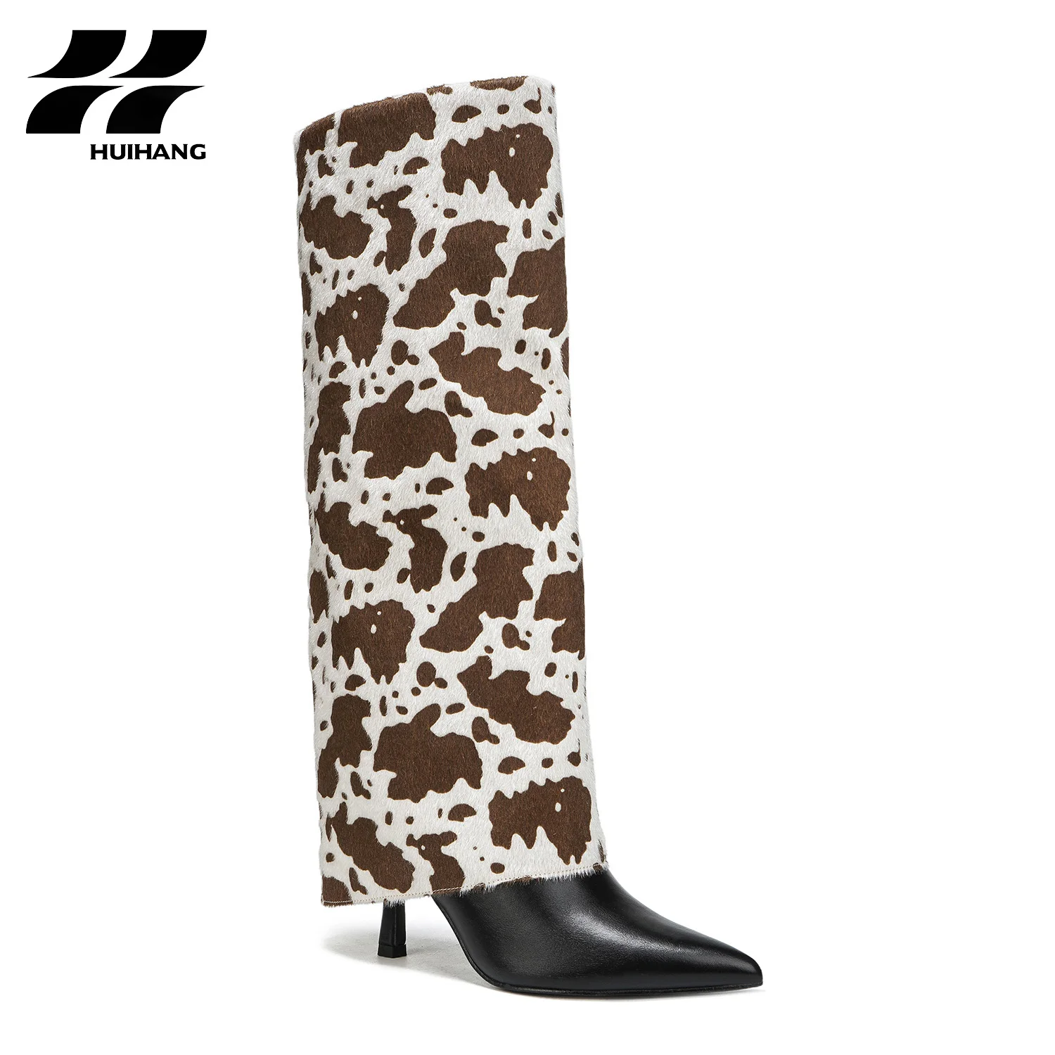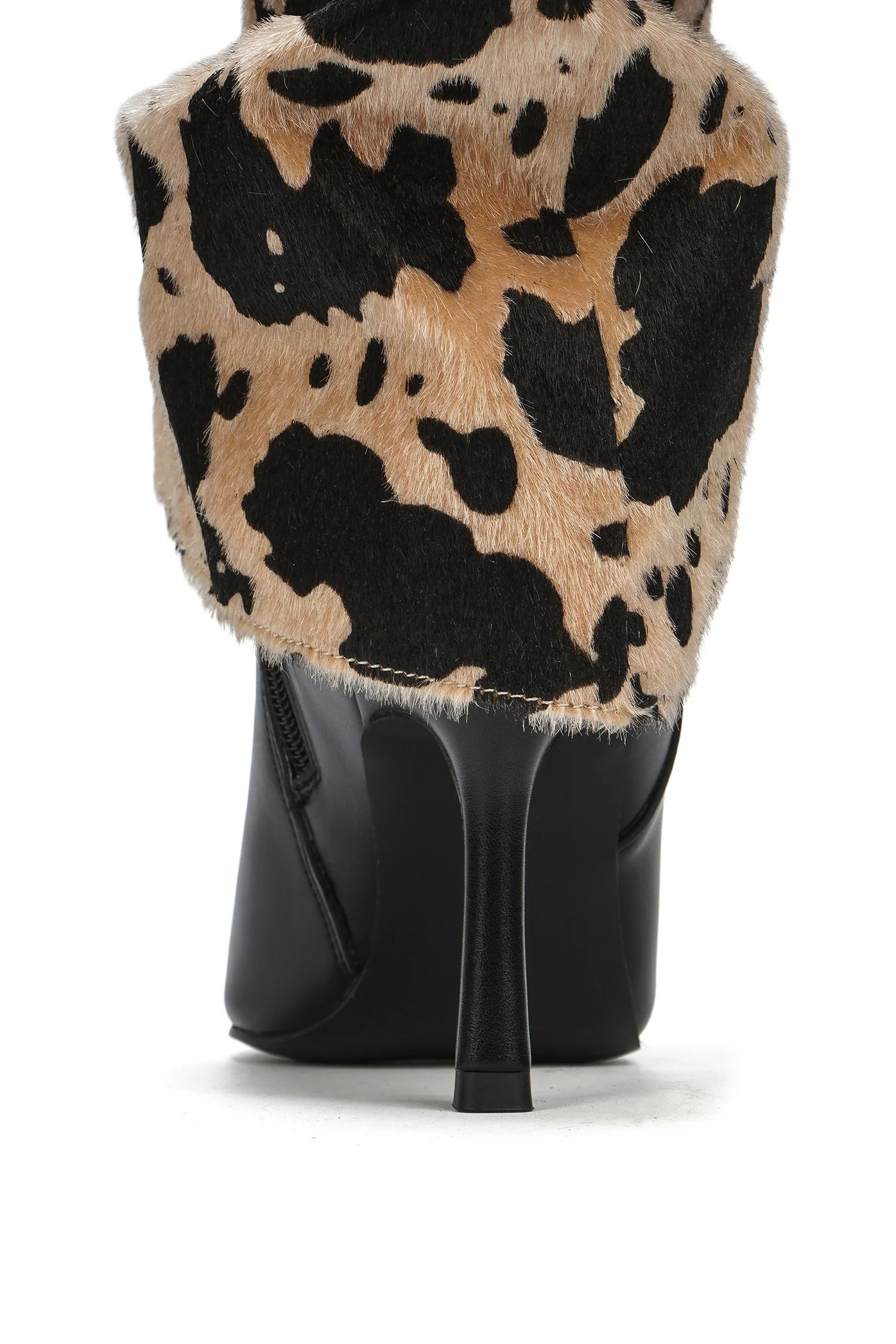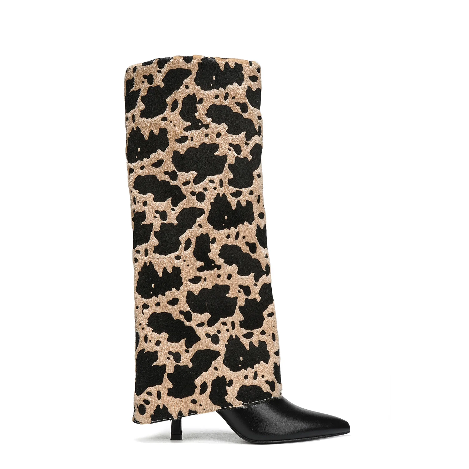 Women's Trendy Cow Print PU Boots Stiletto Heel Comfortable Slip-On Western Style Square Pointed Toe Pvc for Fall Winter