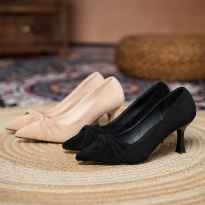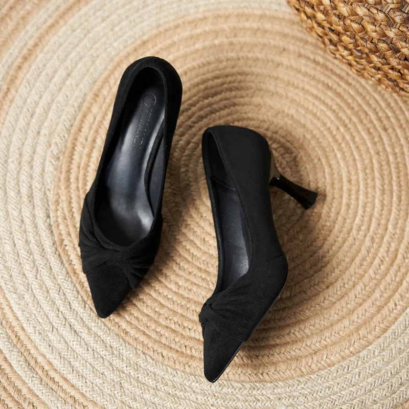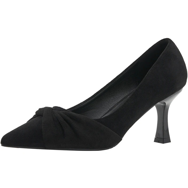 Black Suede Pointed Toe Knot Detail Stiletto Heels, 5CM/7CM Slip-On Pumps for Summer