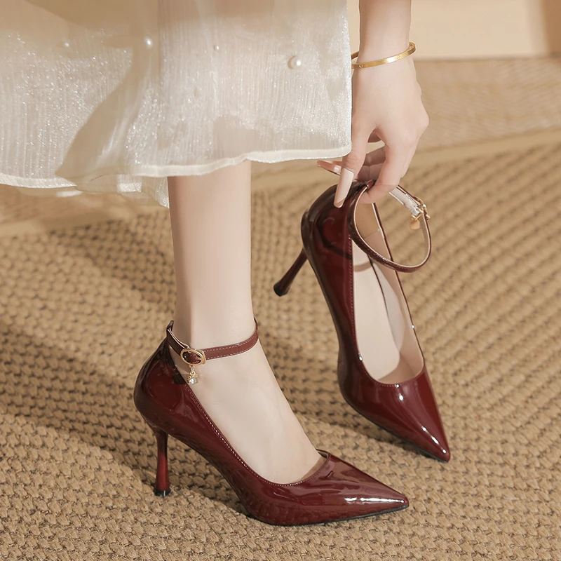 Elegant Burgundy Microfiber Comfortable Pointed Toe Stiletto Heel Ankle Strap Pumps for Summer Women