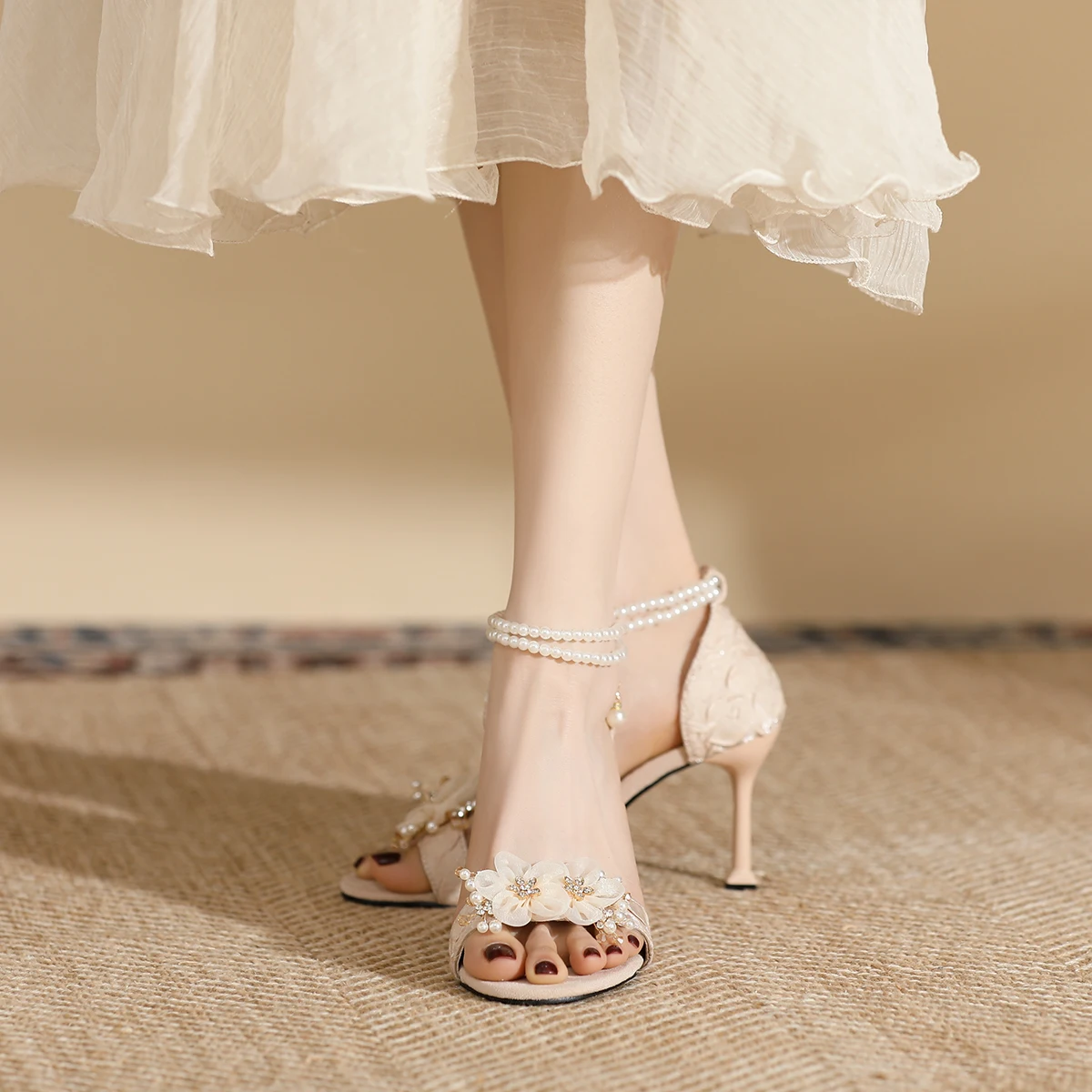 Women's Summer Wedding Shoes Fashion Beige Textured Fabric Slip-On Stiletto Heel Sandals with Bow Accent