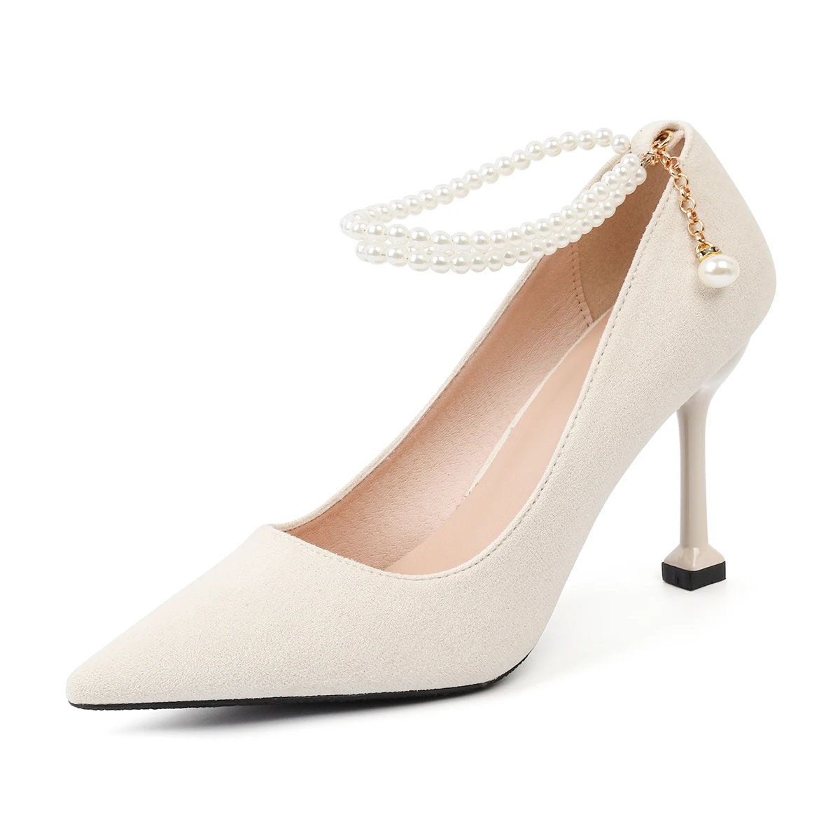 Chic Women's Black Suede Pointed - Toe Stiletto Heel Pumps with Pearl Ankle Strap & Charm