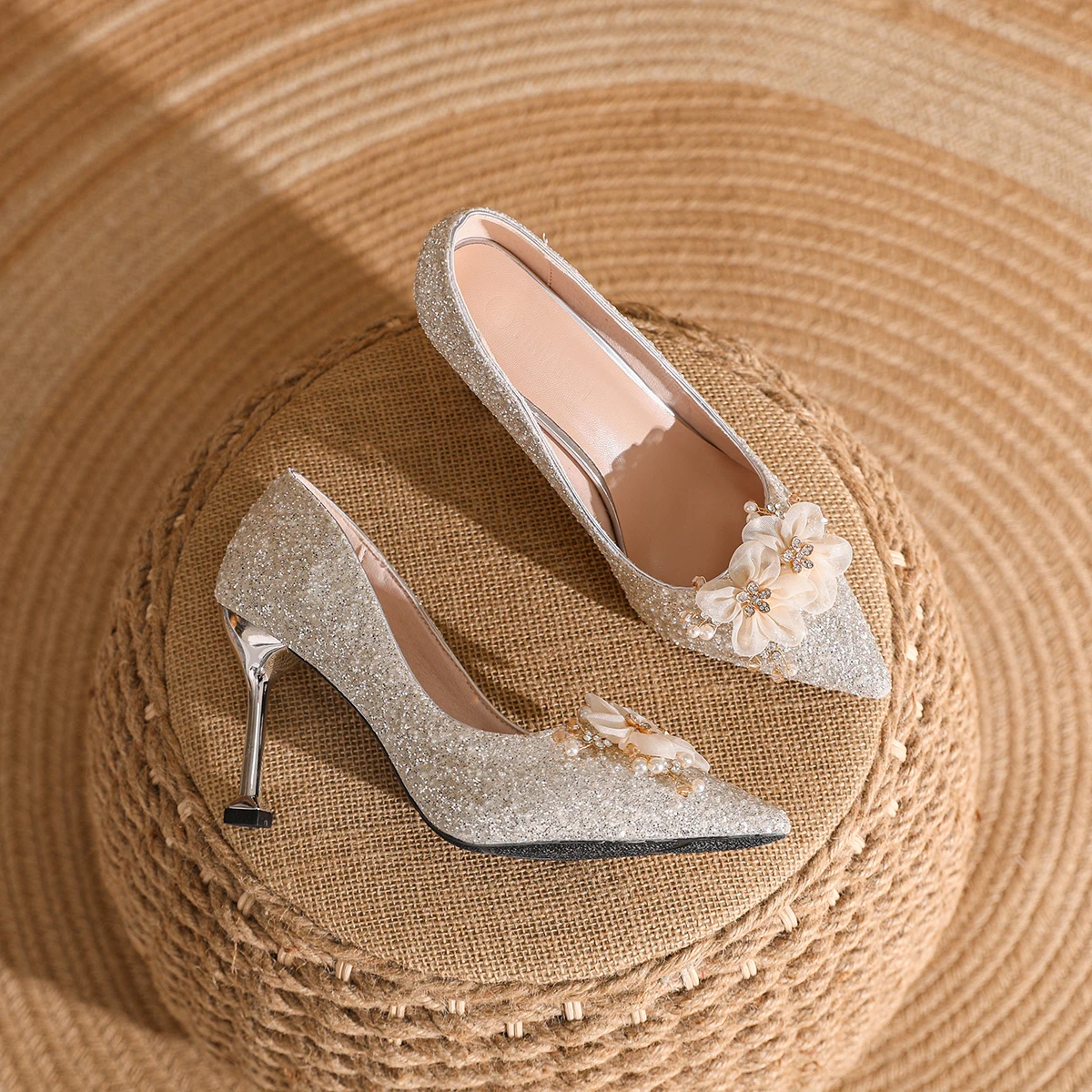 Elegant Silver Glitter Stiletto Heel Pumps with Bow Accent Comfortable Lining Summer for Women