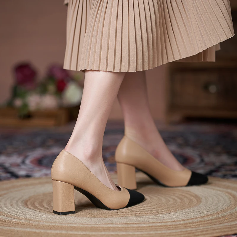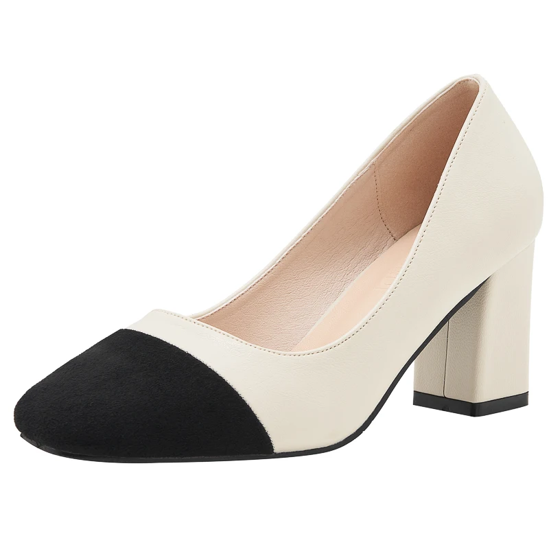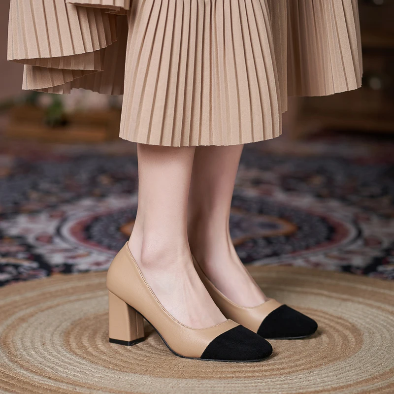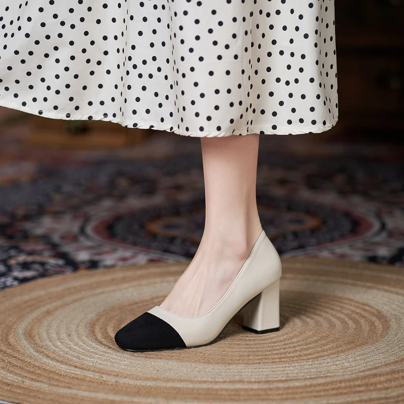 Elegant Beige & Black Two-Tone Microfiber Round-Toe Slip-On Comfortable Summer Block Heel Pumps for Women