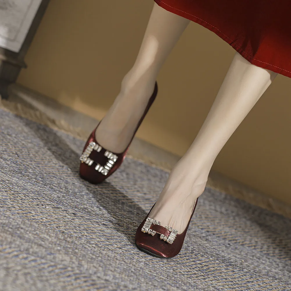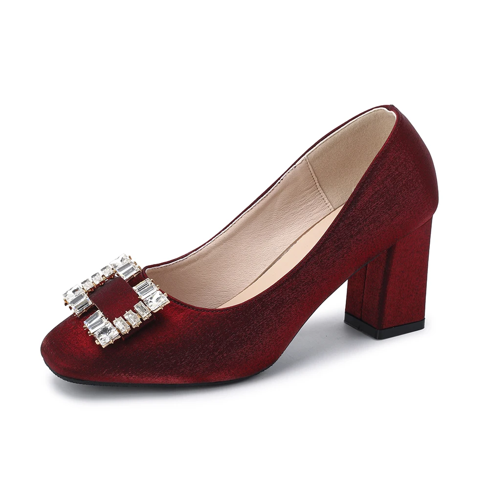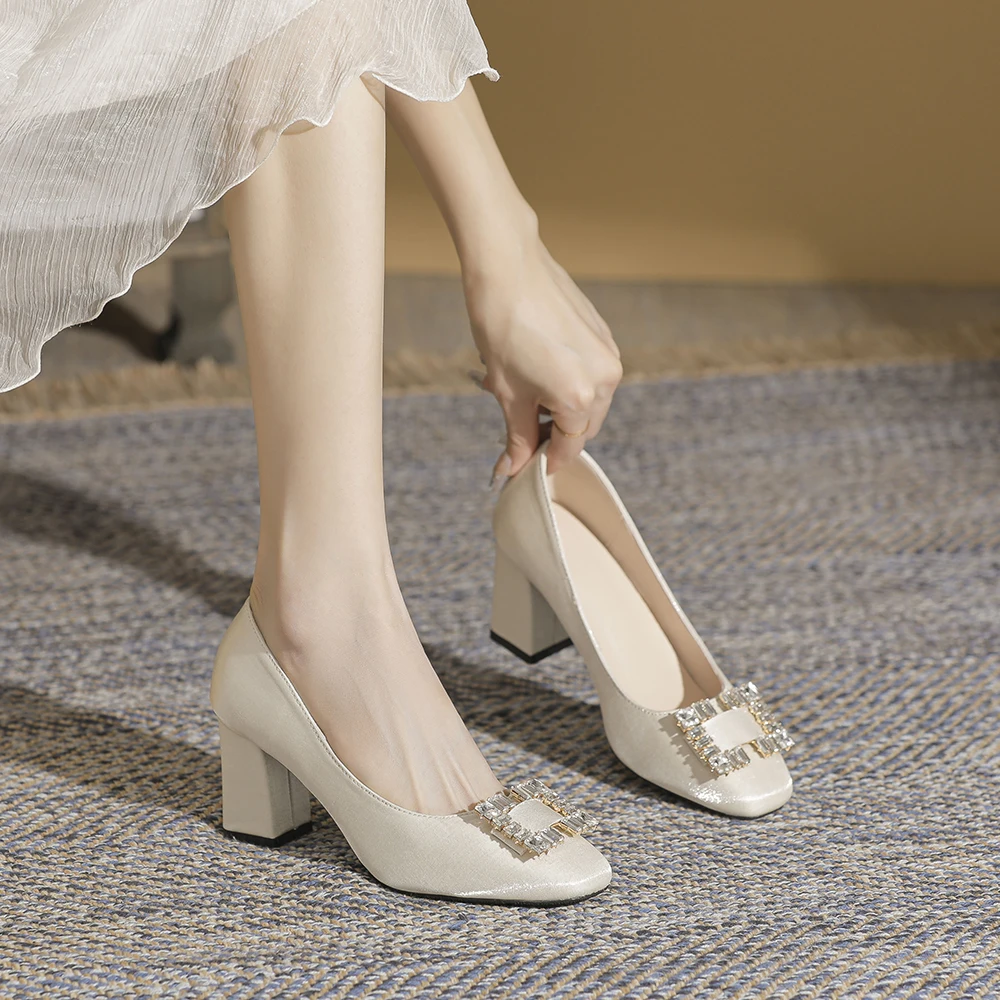 Classy Women's Ivory Satin Square Toe Comfortable Summer Slip-On Block Heel Pumps with Rhinestone Buckle