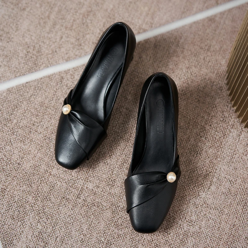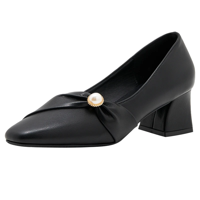 Elegant Black Pu Leather Square Toe Comfortable Slip-On Block Heel Pumps with Rhinestone Accent for Women Summer