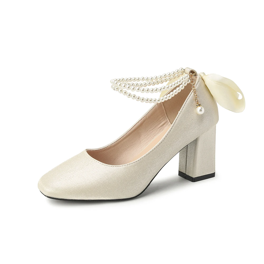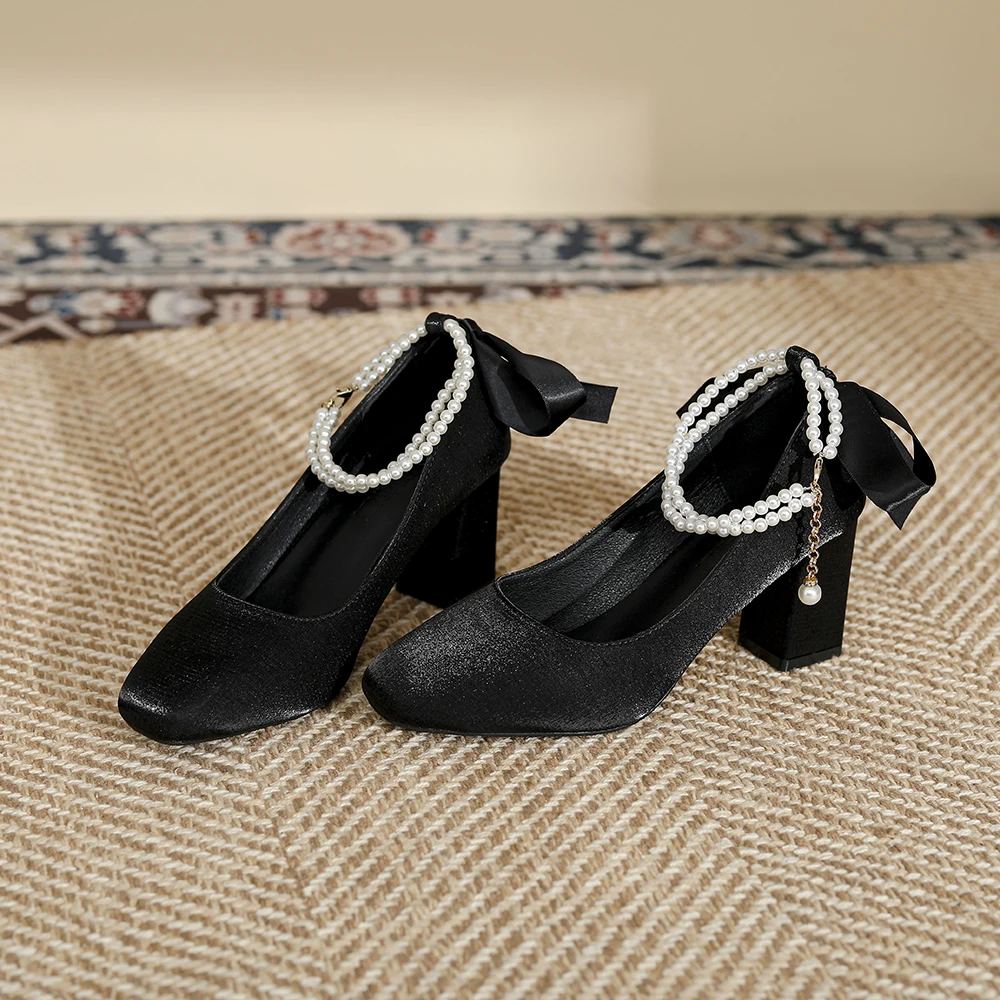 Fashionable Black Textured Fabric Heeled Sandals Square Toe Block Heel Pearl Ankle Chain Bow Accent Comfortable Lining Summer