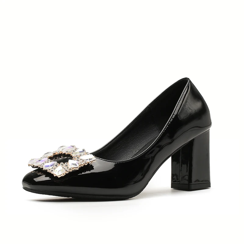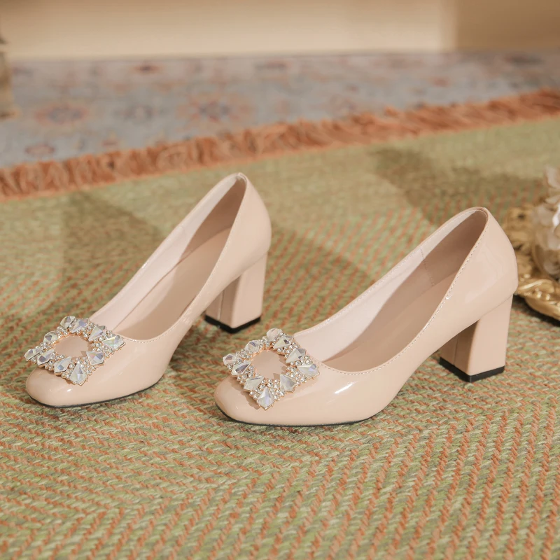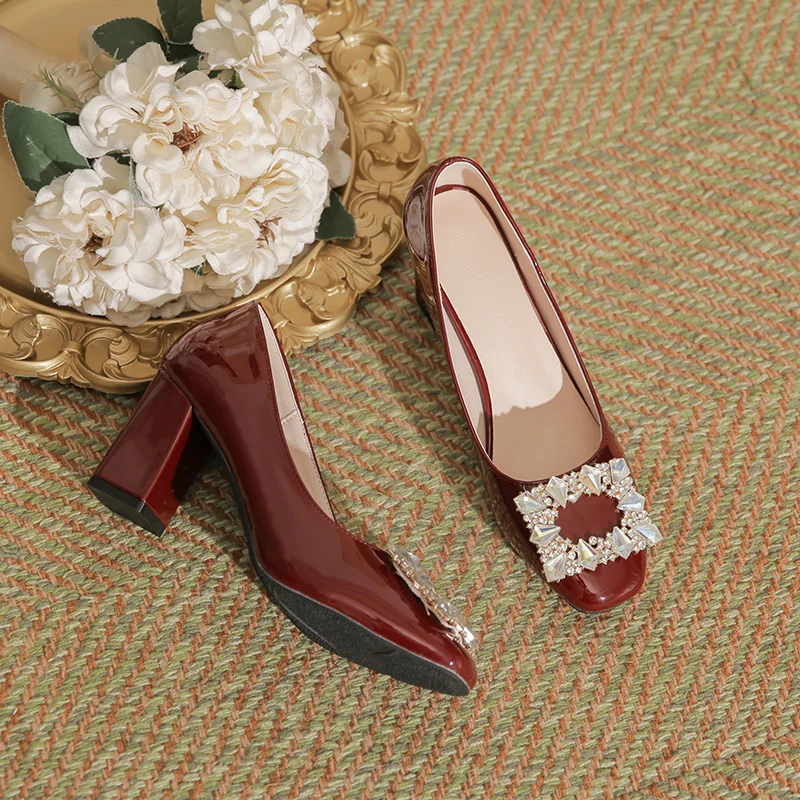 Women's Comfortable Summer Fashion Burgundy Textured Patent Leather Square Toe Block Heel Slip-On Pumps with Rhinestone Buckle