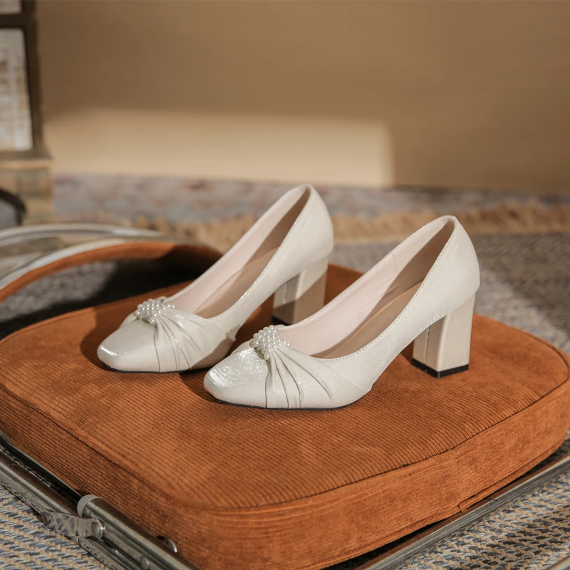 Women's Elegant Ivory Textured Fabric Square Toe Block Heel Heeled Sandals with Pearl Accent Comfortable PVC Outsole