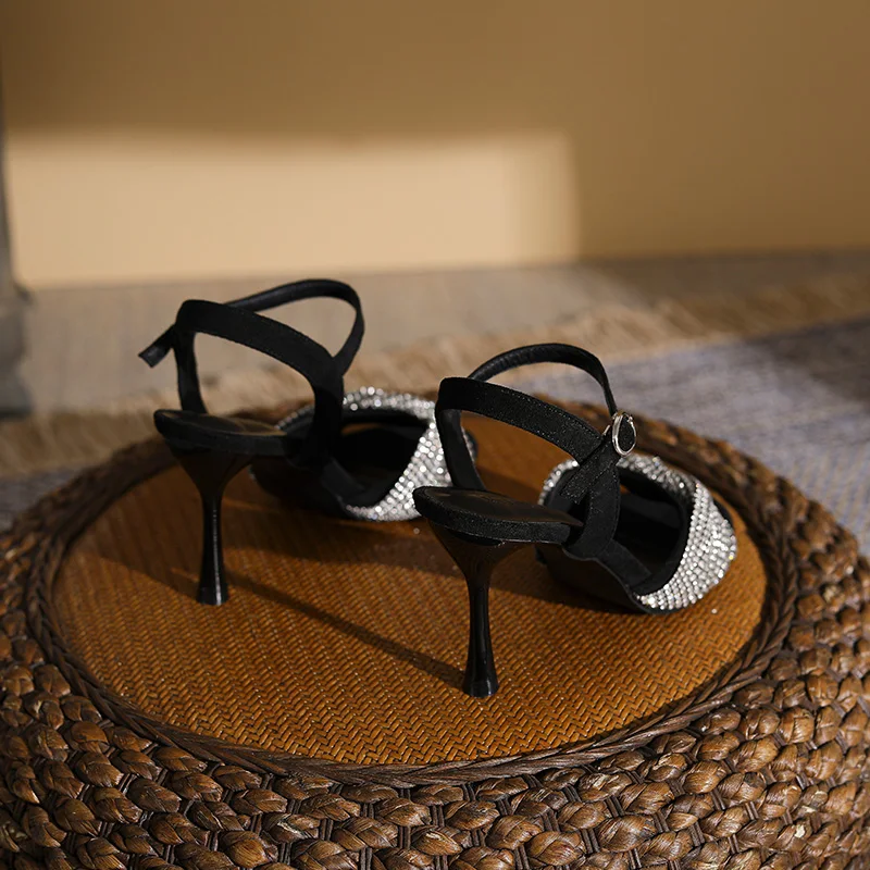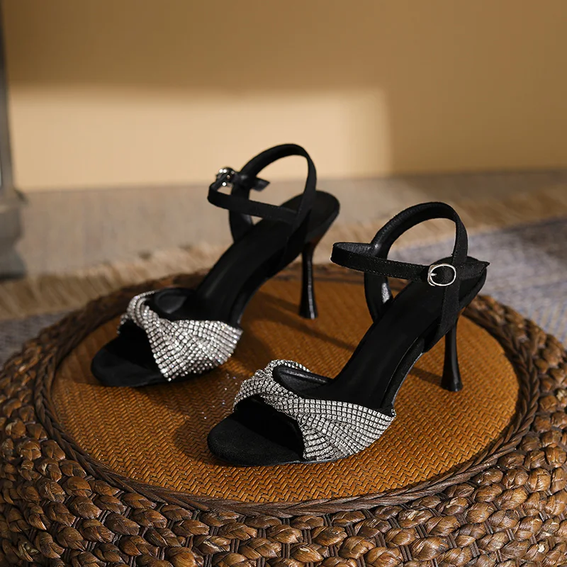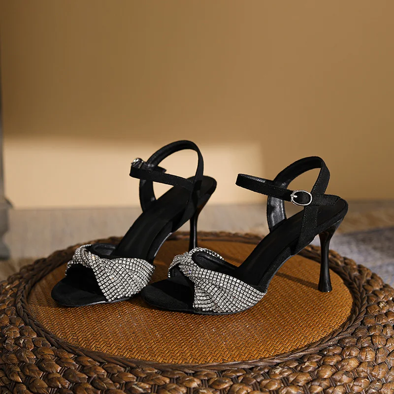 Stylish Comfortable Black Suede Summer Slip-On Sandals with Stiletto Heel Rhinestone Knot and Silver Buckle
