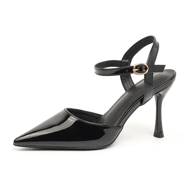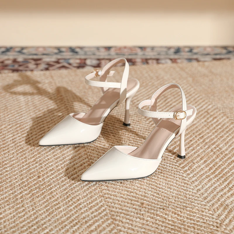 Chic Women's Comfortable Summer Ivory Patent Leather Slip-On Pointed Toe Stiletto Heel Sandals with Ankle Strap & Gold Buckle