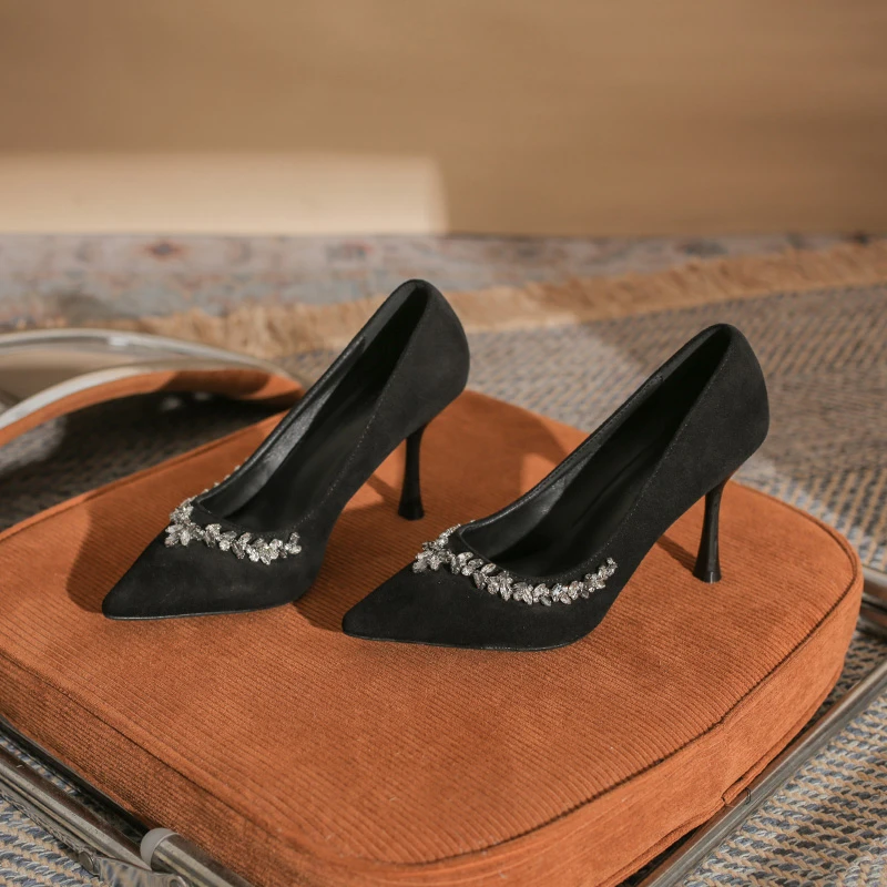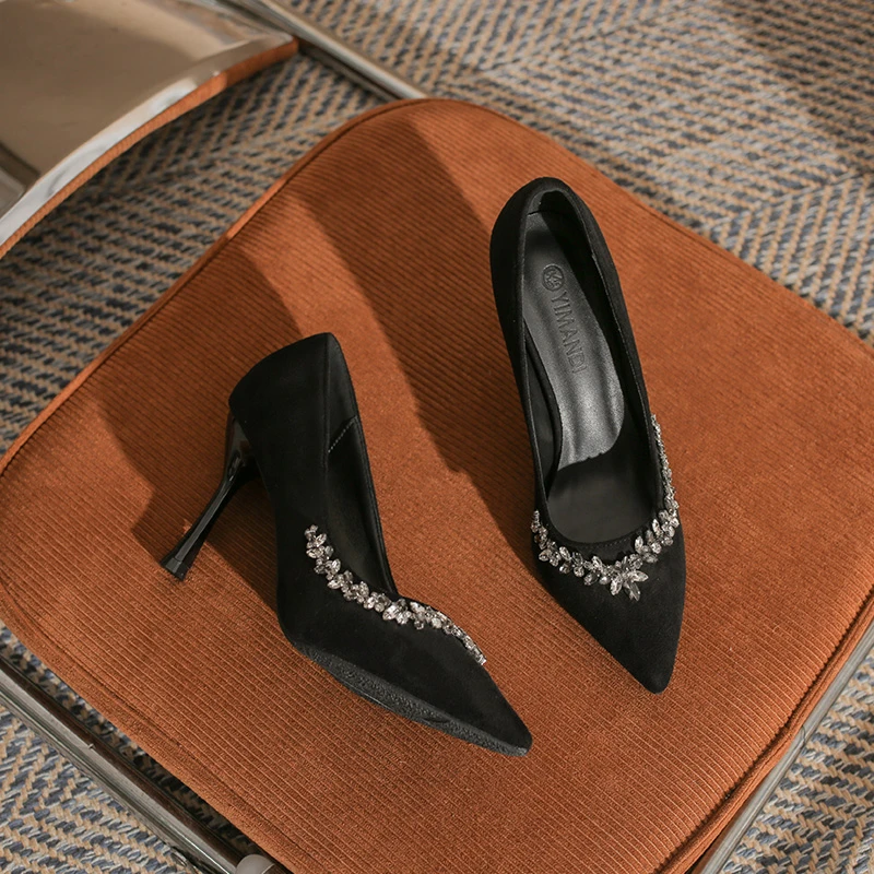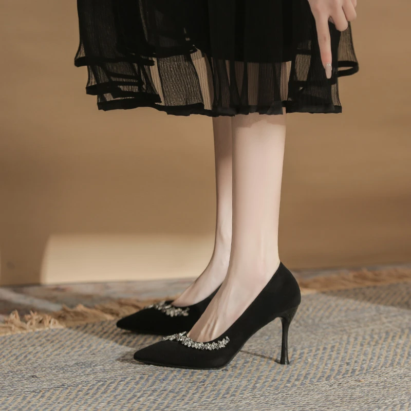 Classy Women's Black Suede Comfortable Pointed-Toe Stiletto Heel Summer Pumps with Silver Rhinestone Trim Detail