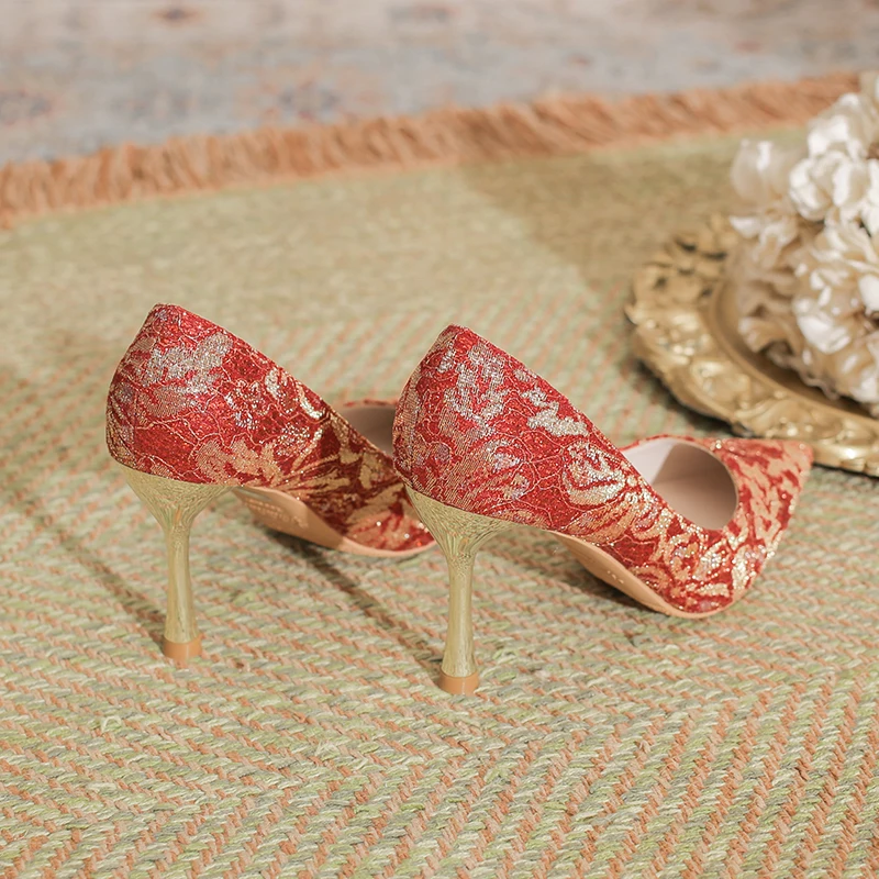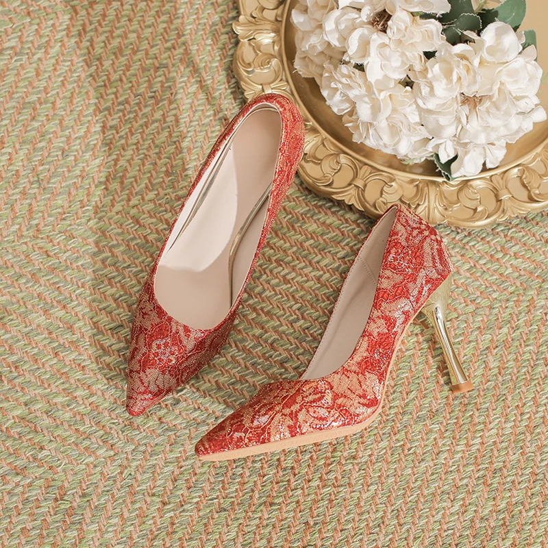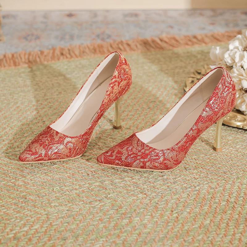 Chic Women's Red Lace & Glitter Pointed-Toe Comfortable Summer Slip-On Stiletto Heel Pumps with Metallic Heel