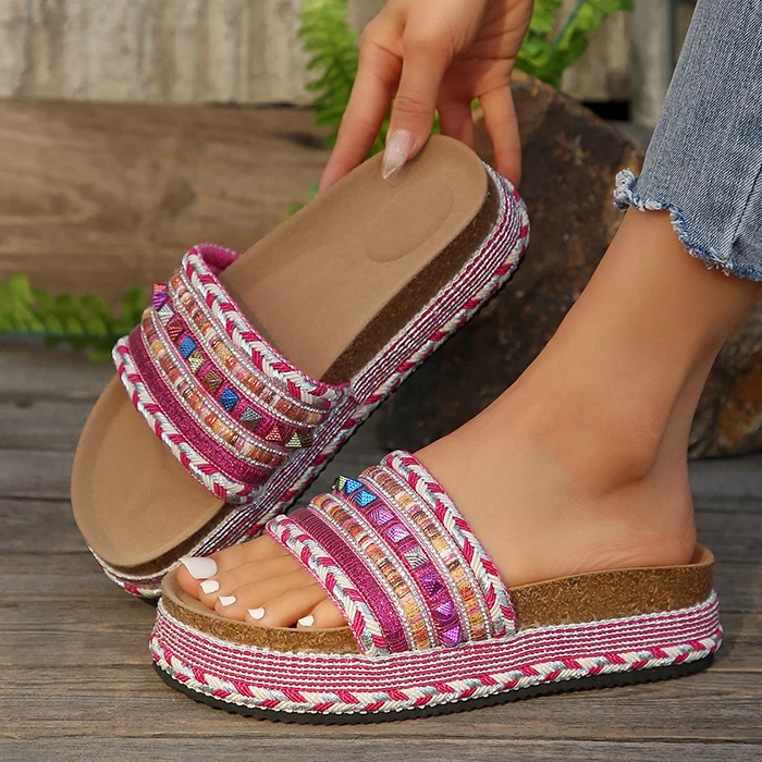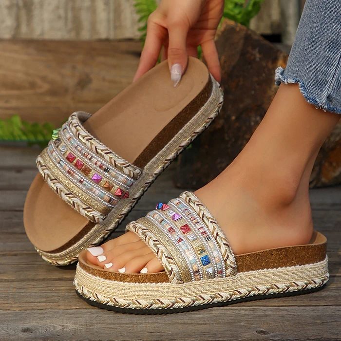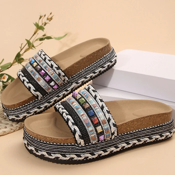 Wholesale Big Size Women Slides Thick Soles Sandals Denim High Platform Wedge Heels Beach Flat Slipper Outdoor Shoes