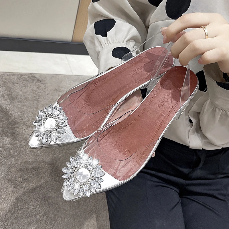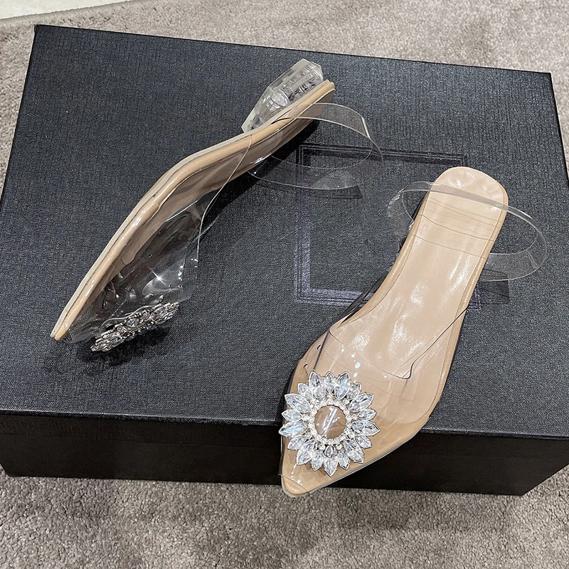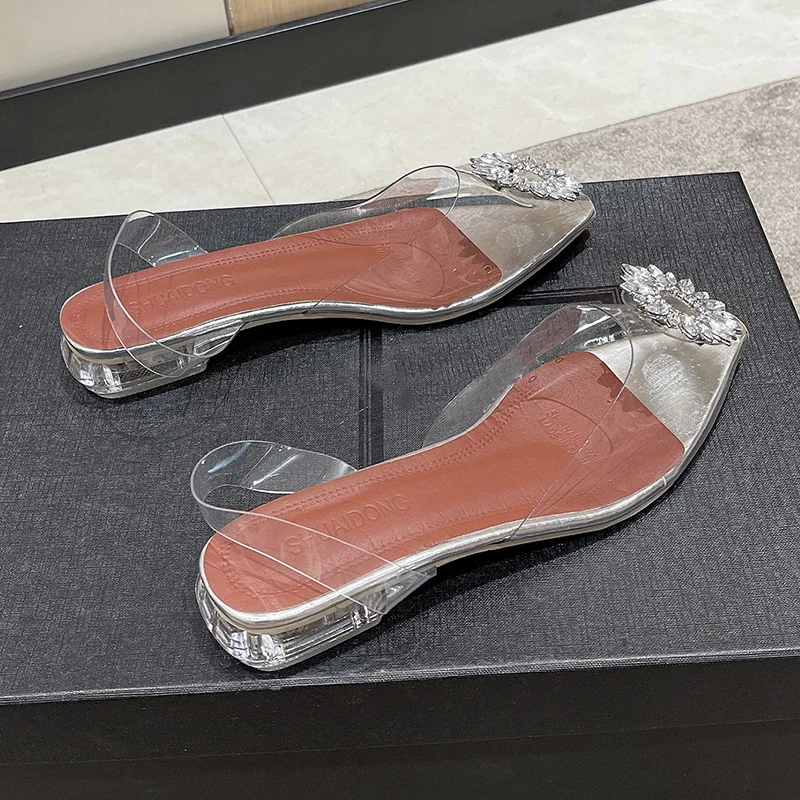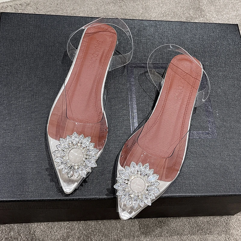 New Style Wholesale Women Rhinestone Big Size Transparent Crystal Heel Flat Ladies Sandal Dress Party Wedding Shoes