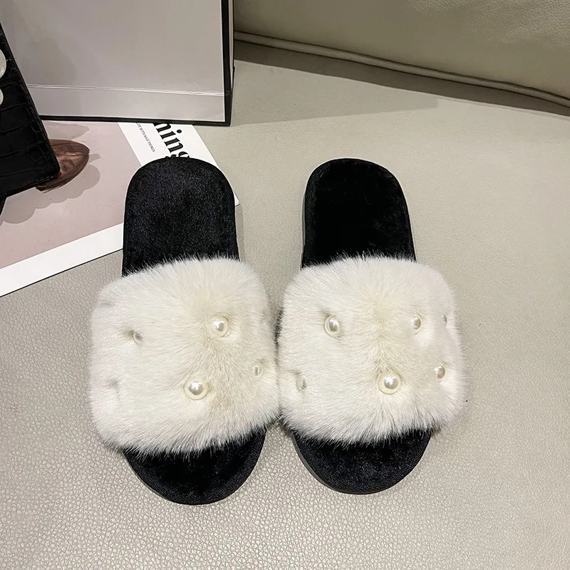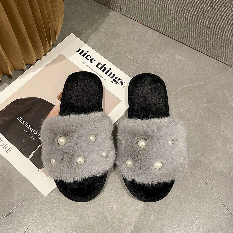 Women's Winter Indoor Fluffy for Slippers Glaring Pearl Open Toe Design Soft Warm Plush Non-Slip & Flat Hot Selling