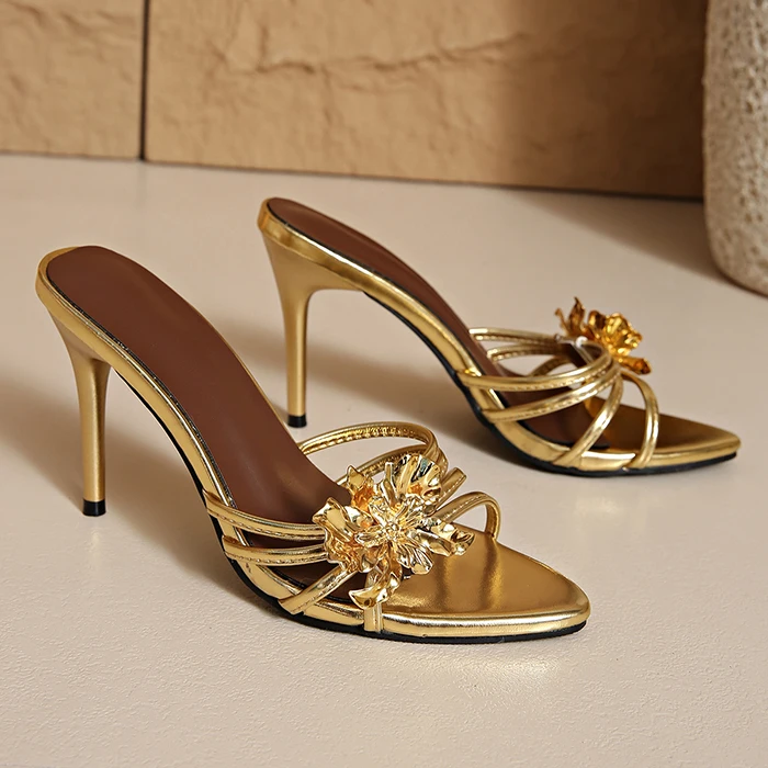 2026 New Trendy Elegant High Heels Slippers Sexy Open Toed Women's Sandals with Metal Flower Decoration