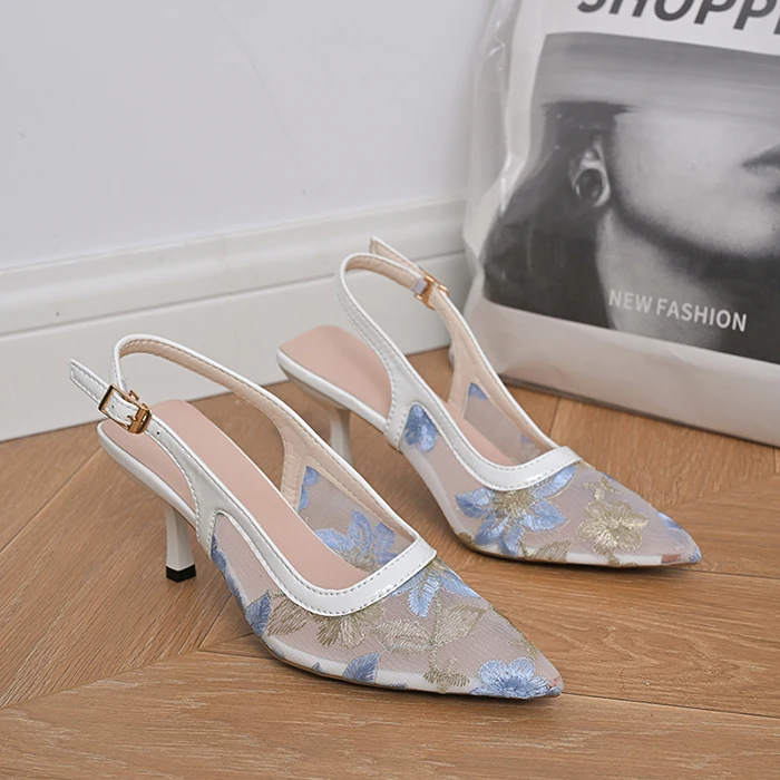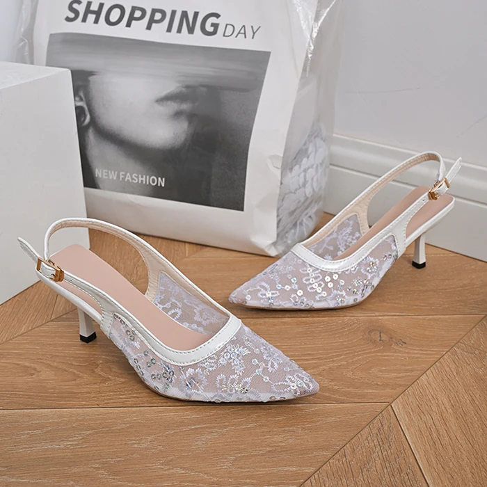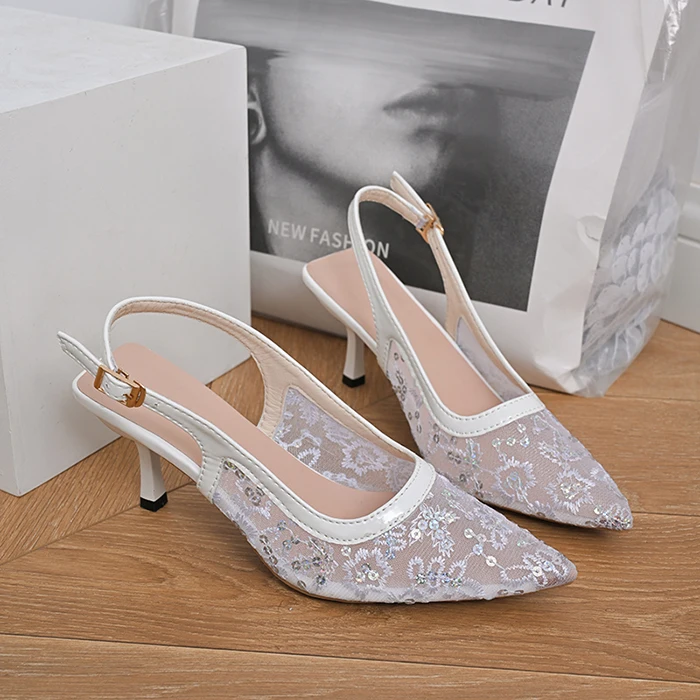 Wholesale Plus Size Elegant High Heel Pointed Toe Thin Heeled Women Sandals Lady Heels Embroidered Beaded Lace Mesh Sandals