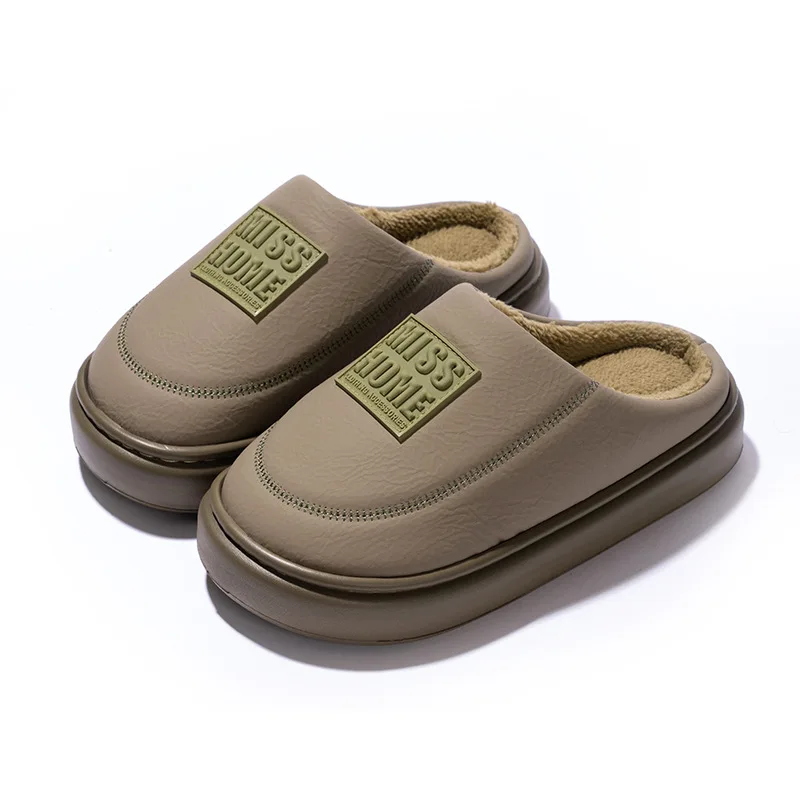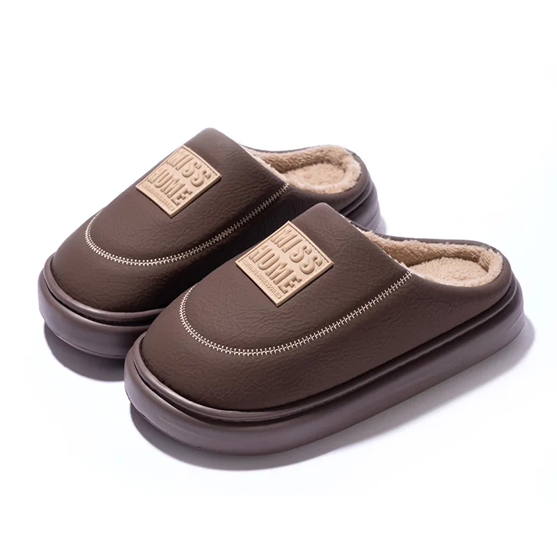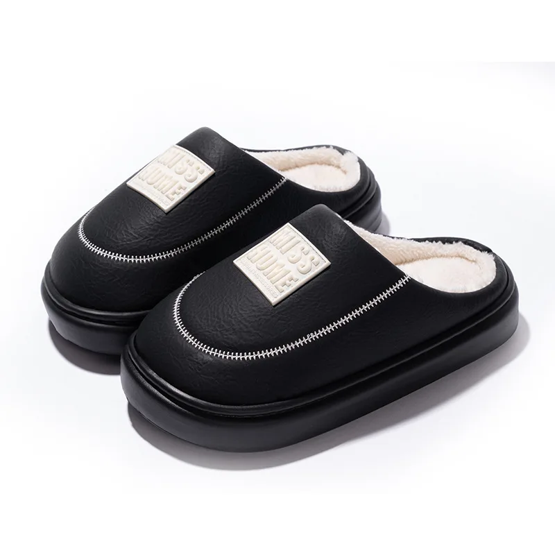 Hot Selling Couple's Waterproof Plush Slides for PU Upper New Fashion Fluffy Winter Warm Closed Toe Women's Thick-soled EVA