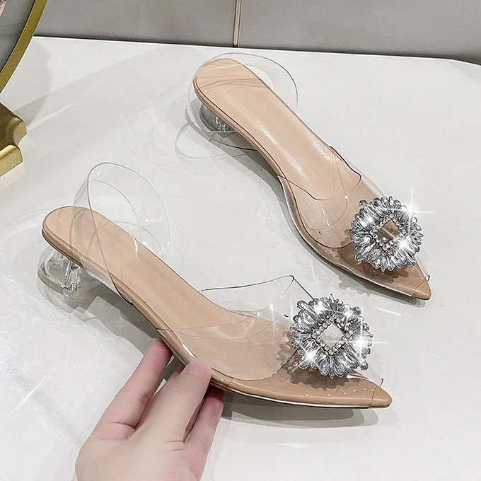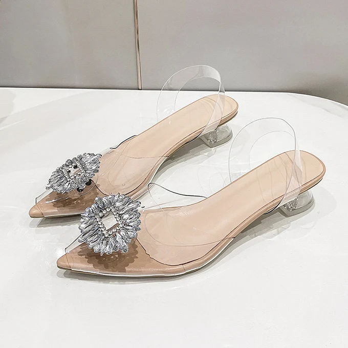 China Wholesale Big Size Low Heel Pointy Toe Rhinestone Buckle Sandal Jewelry Transparent Sandals for Women Bridal Sandals
