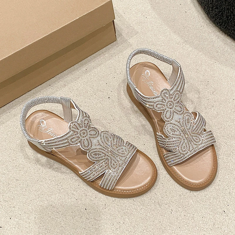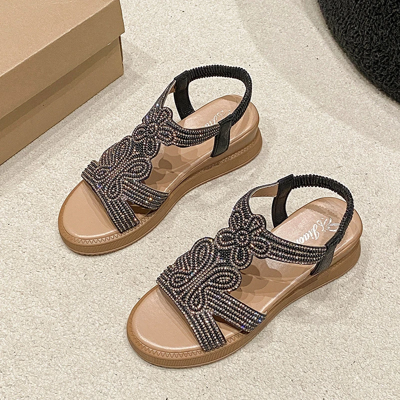 New Wholesale Trendy Large Size Lady Roman Beach Rhinestone Upper Wedge Heel Sandals Women's Shoes