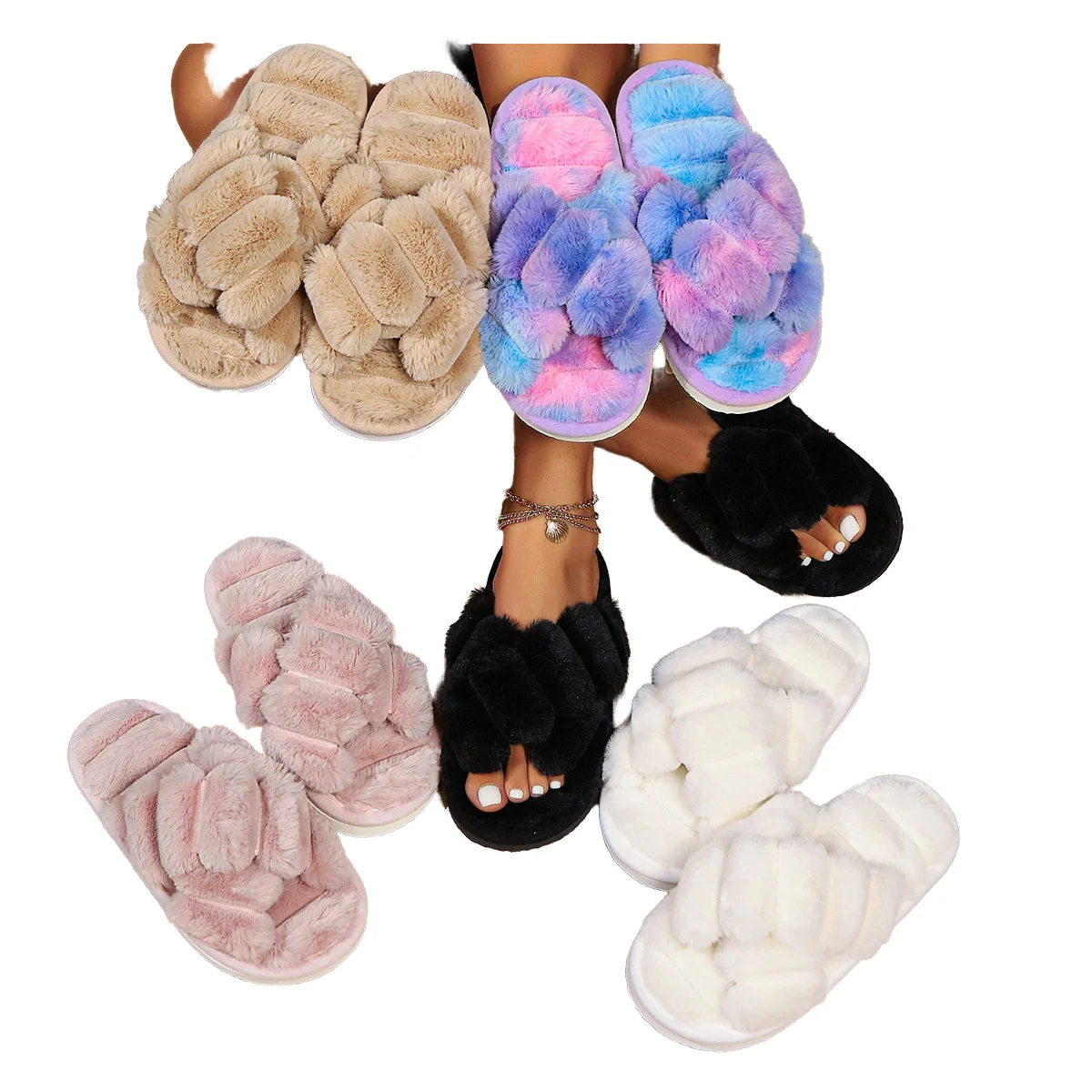 Hot Sales for Women Plush Open Toe Fluffy Shoes Winter Warm for Slippers Anti-Slip EVA Thick Bottom Cross Cotton for Home Wear