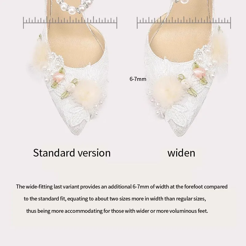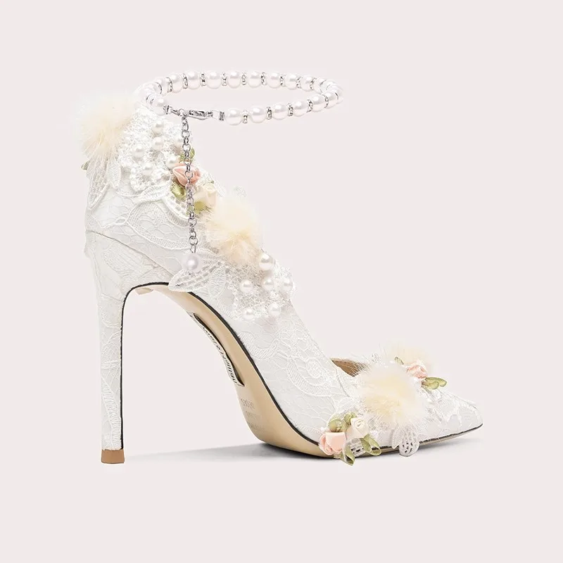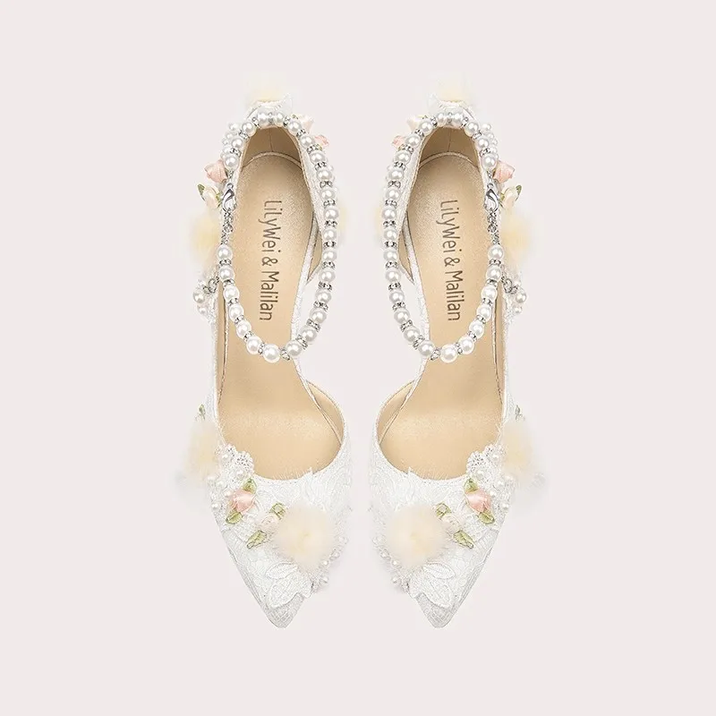Elegant Bridal Heels with Pearl Ankle Strap Lace Flower Fur Decor Romantic Wedding Shoes for Brides