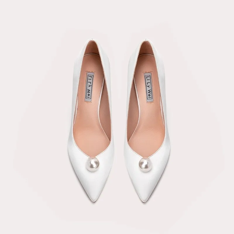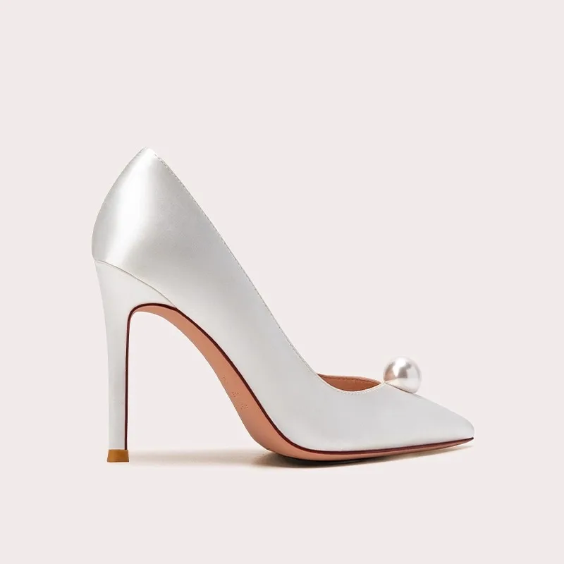 Exquisite White Satin Stiletto Pumps Pointed-toe with Pearl Embellishment Ideal for Bridal and Formal Events