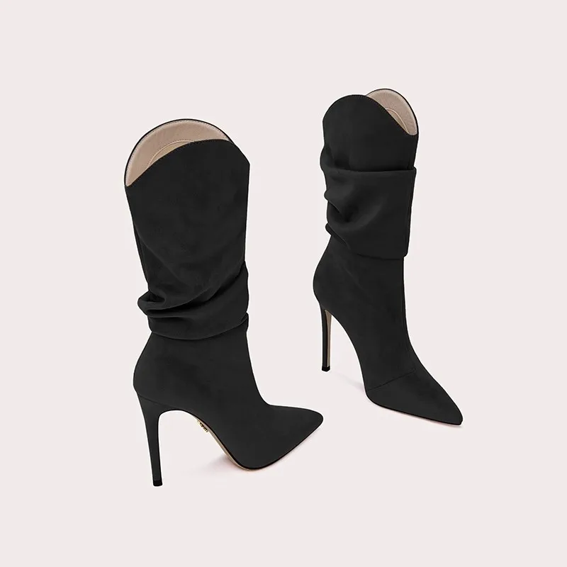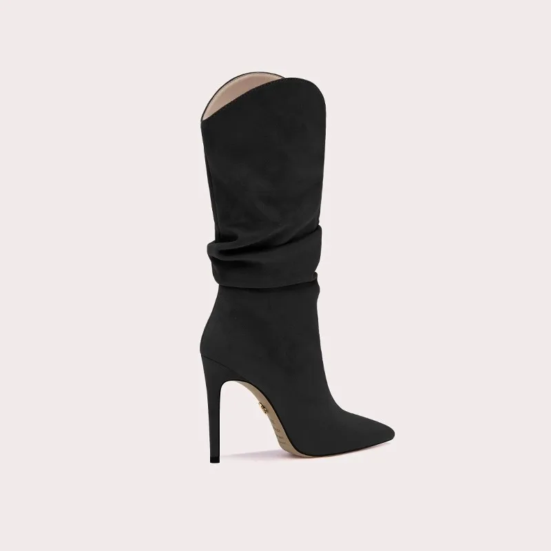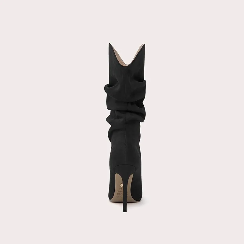 Women's Stylish Black Suede Knee-High Boots with Thin Heel and Pointed Toe High Top Height Increasing Feature for Winter