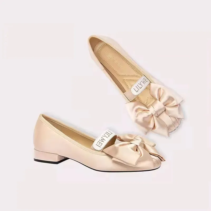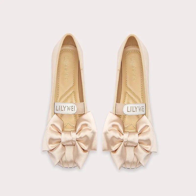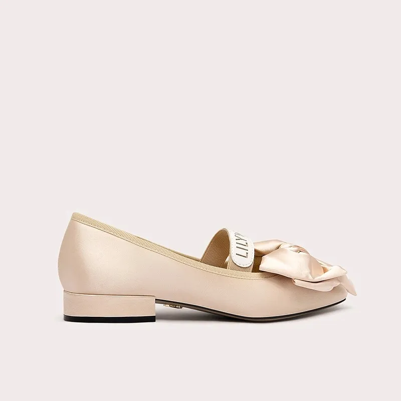 Latest Model Light Champagne Round Toe Flat Shoes for Women with Large Satin Bow and Branded Strap Comfortable Stylish