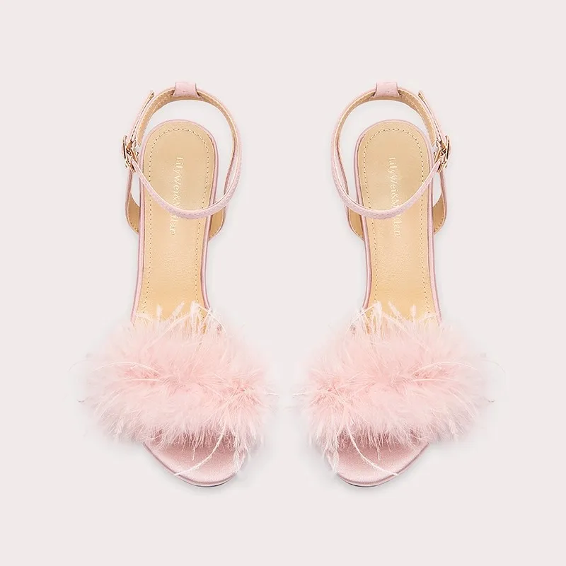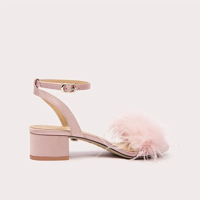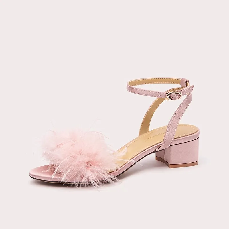 Chic Feather Decor Pink Open Toe Sandals With Ankle Strap Elegant for Party and Evening Events