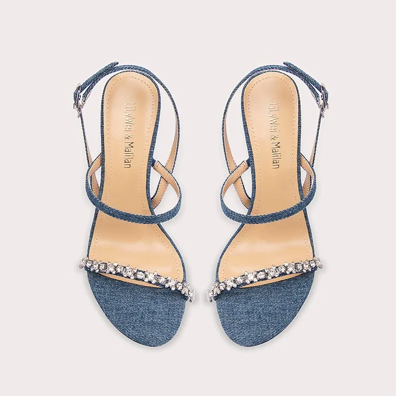 Glamorous Denim Fashion Sandals Adorned With Dazzling Rhinestone Embellishments Boasting Ankle Straps and High Heels