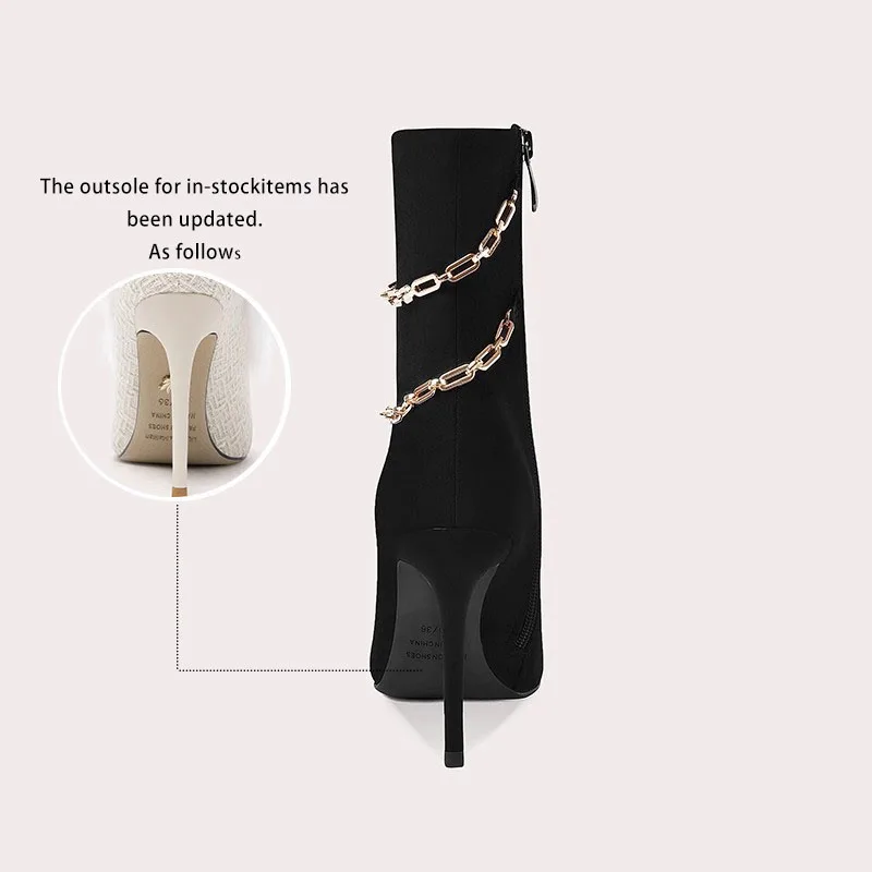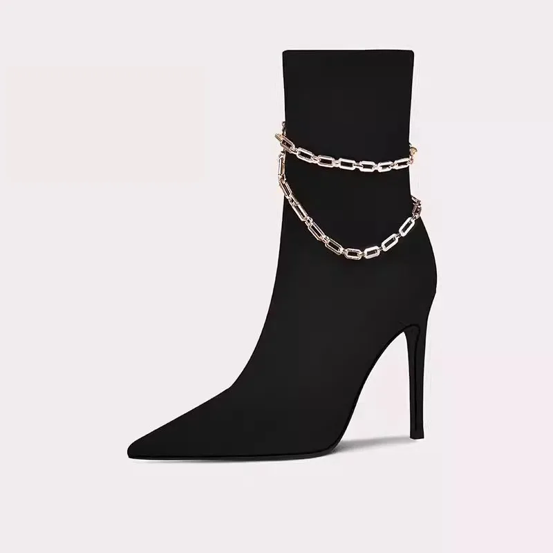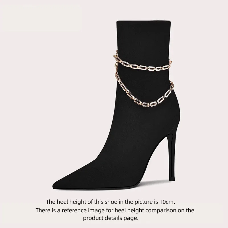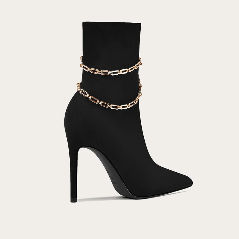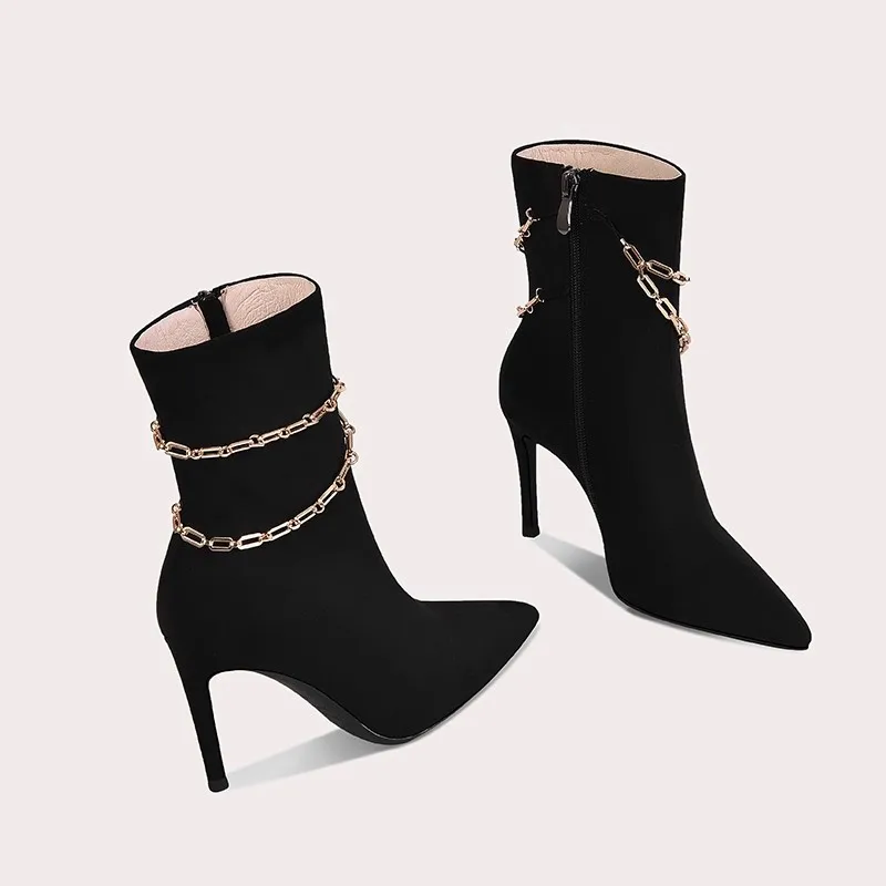 Pointed Toe Stylish Gold Metal Chain Short Boots Black Stilettos High Heel Booties for Women Winter Shoes