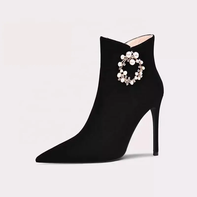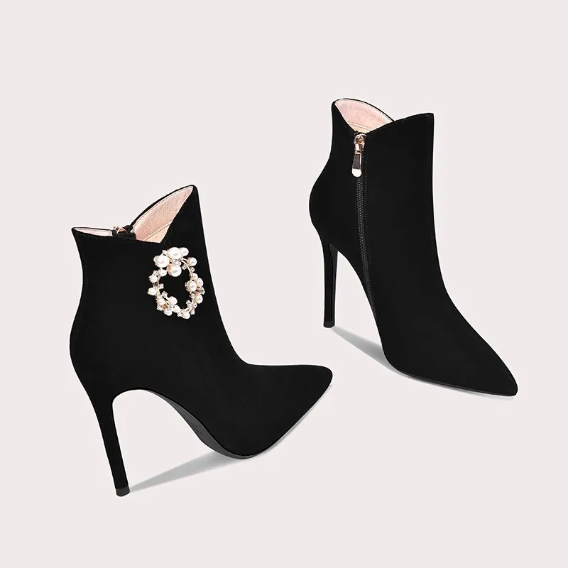 Suede Upper Black Stiletto Cusp Boots for Women Casual Social Winter Shoes with Pointed Toe Breathable Feature Autumn Heel