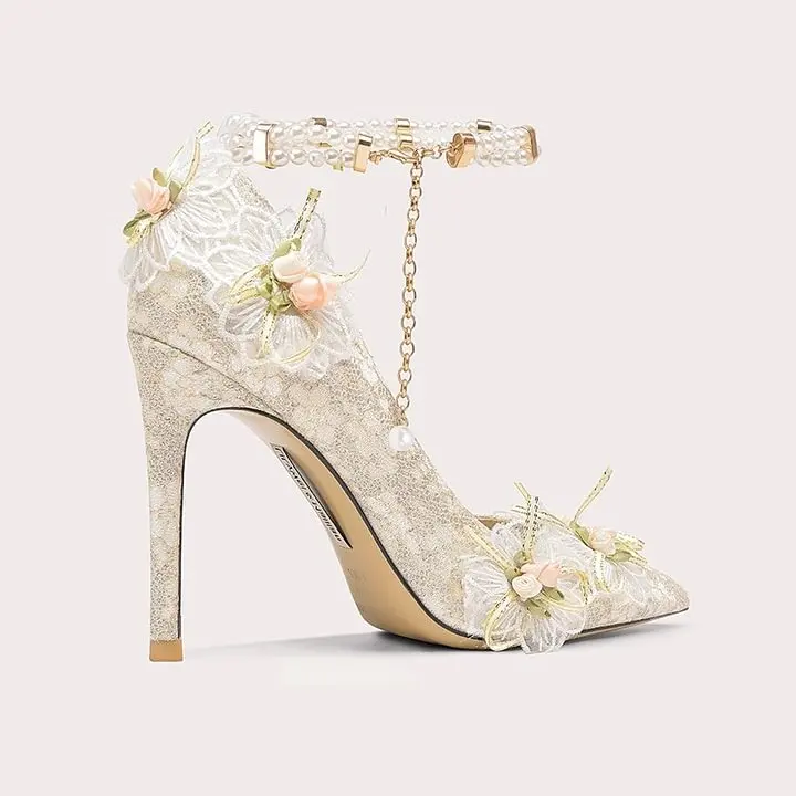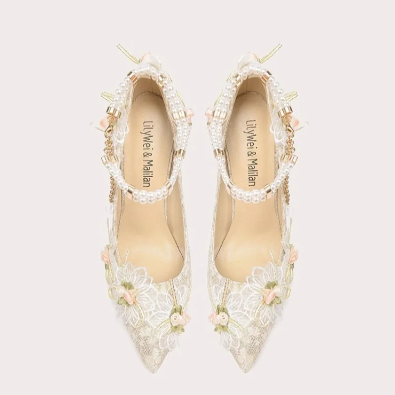 Elegant Luxury Female Pumps with Pearls Crystal Sequins Wrap-Toe for Women Thin Heels Wedding Shoes for Spring