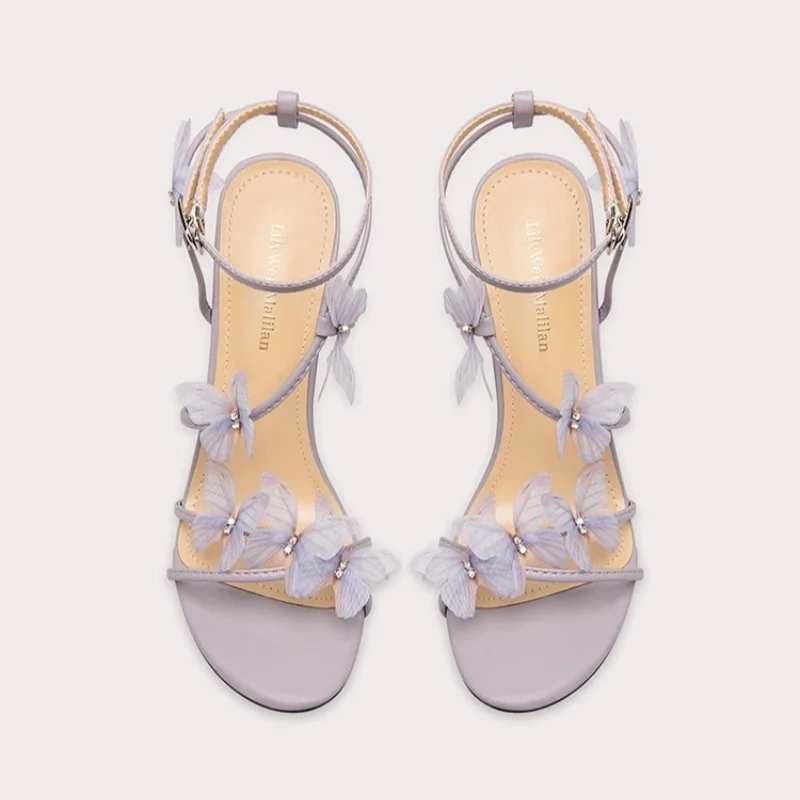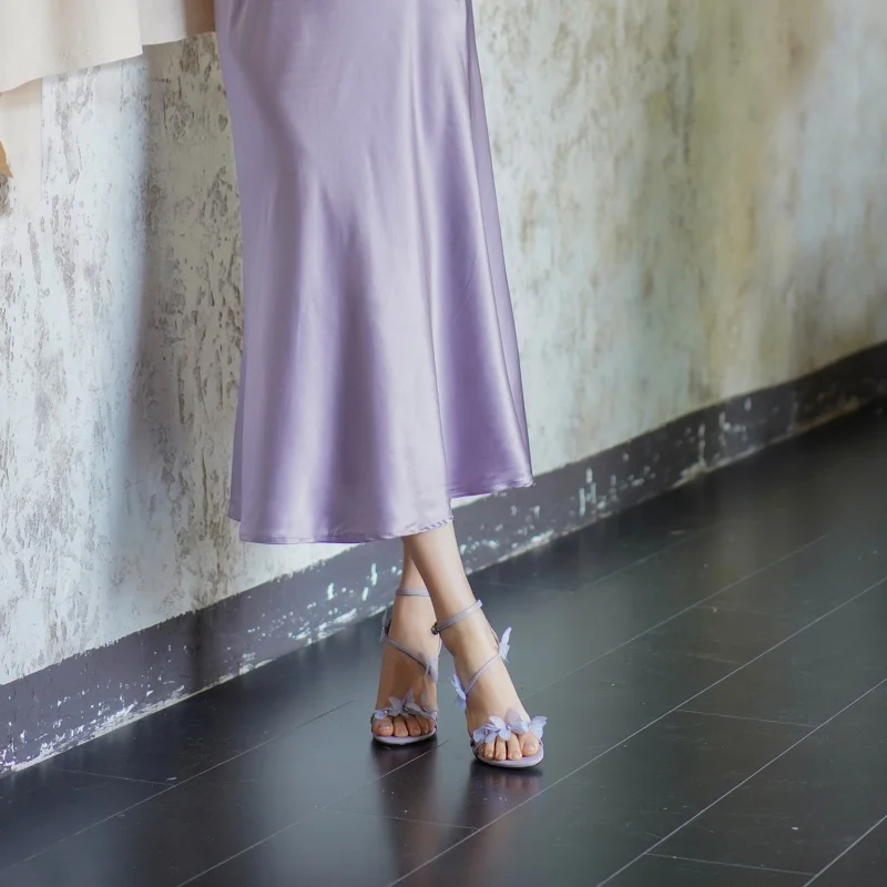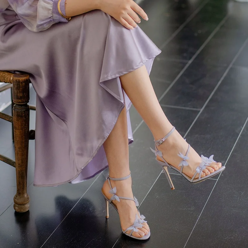 Purple Butterfly Embellished High-Heeled Club Sandals Slip-On Open Toe Design with Thin Heels for Summer