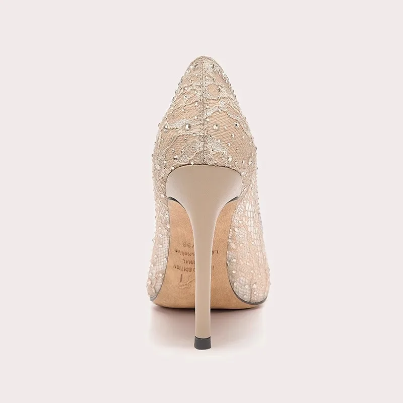 Women's Single Shallow Mouth Stiletto High Heels Pointed Toe Mesh Hollow Lace Striped Fashionable Bridal Party Shoes PU