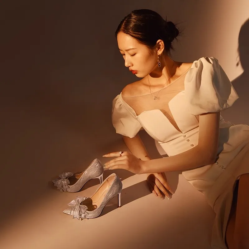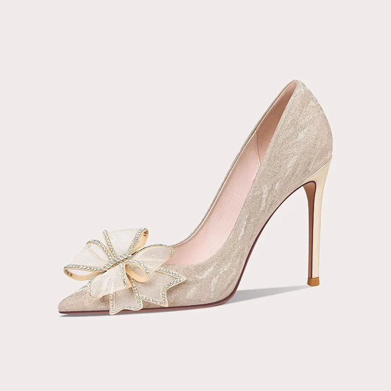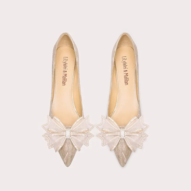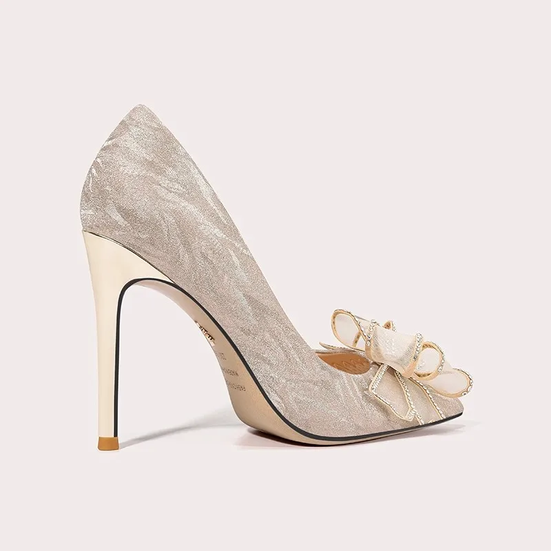 Modern Champagne Gold Bridal Shoes with Bow Accent Pointed Toe High Heels for Wedding Elegance Comfort