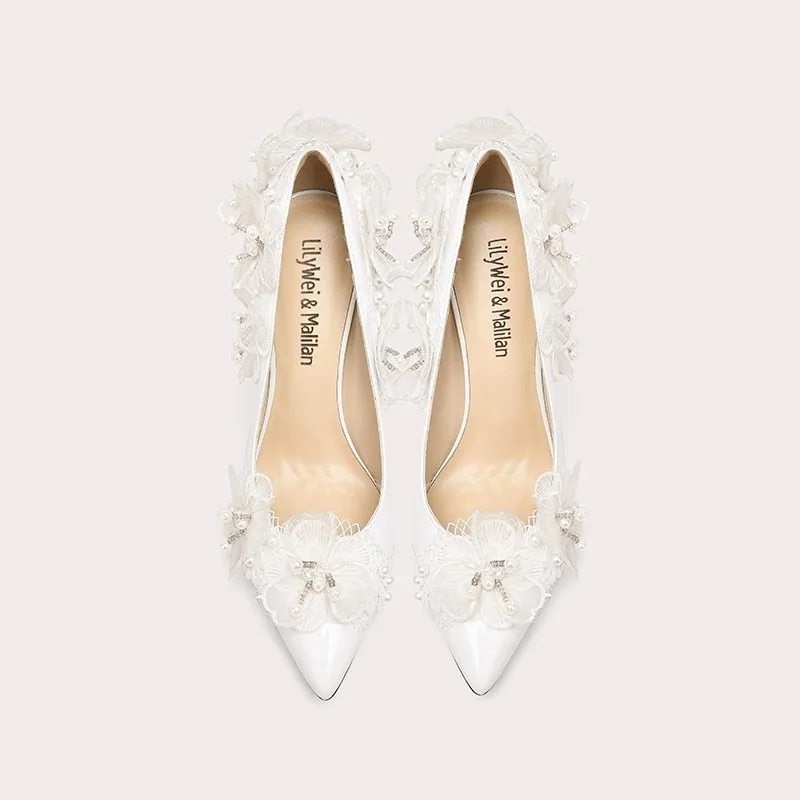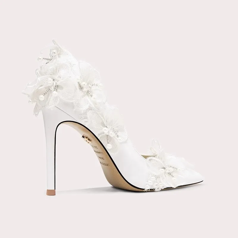 Customized Height Women's Elegant White Lace Floral High Heels with Pearl Decor and Stiletto Heel