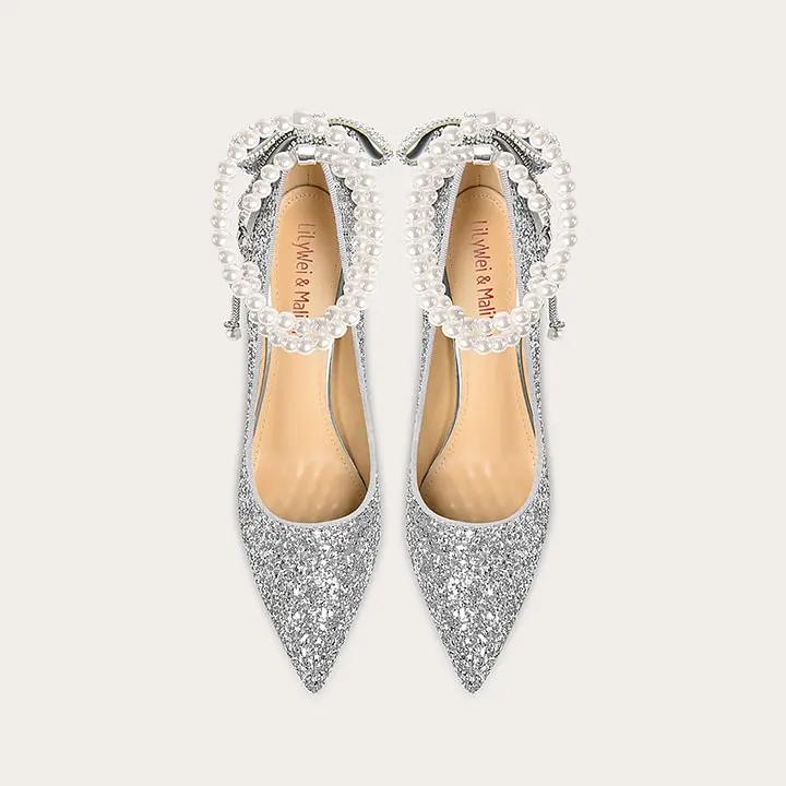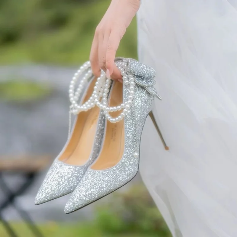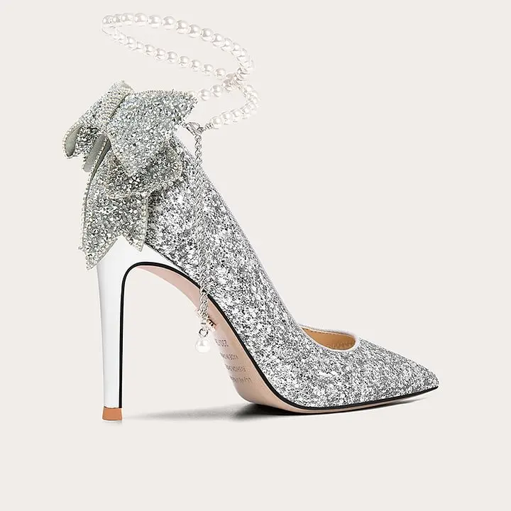 Women's Bridal High Heels Wedding Shoes Thin Heels Slip-On Closure Crystal Sequin Pearl Chain Bowknot for All Seasons-