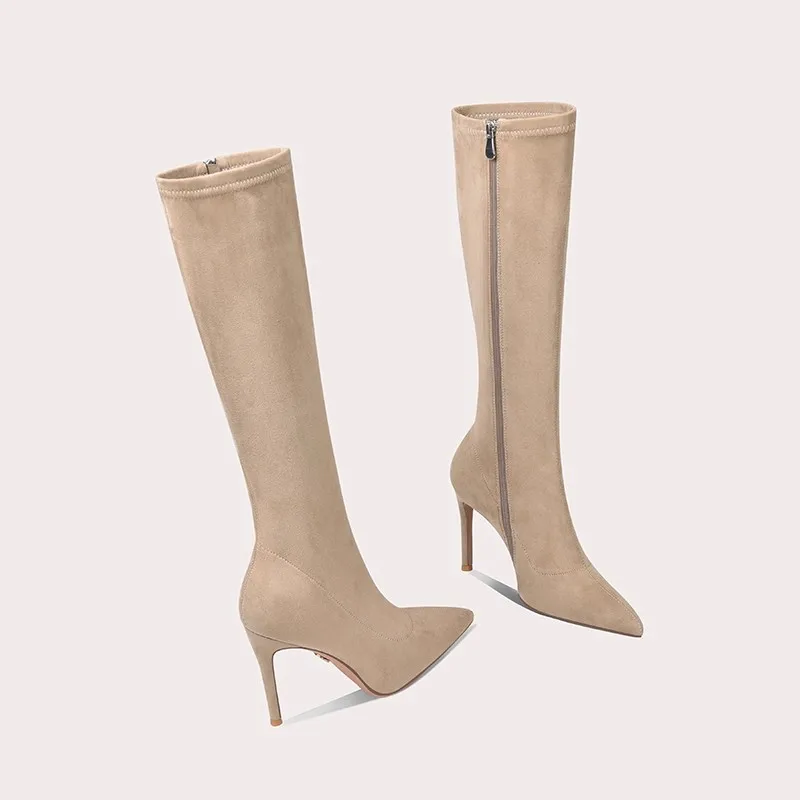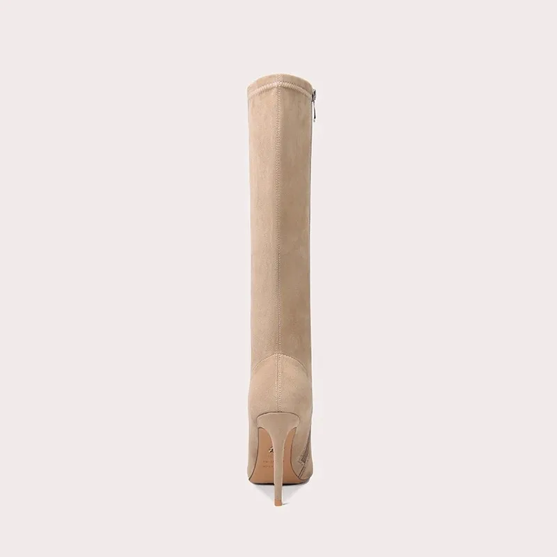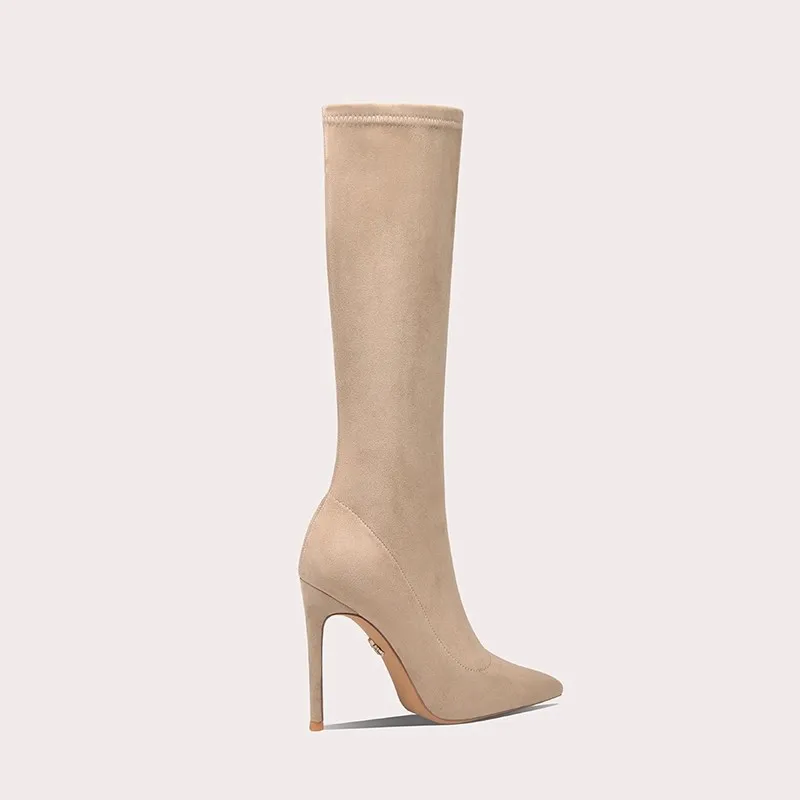 Lily Wei Luxury Designer Custom Womens Pointed Over-the-Knee Ankle Boots with Long Sleeves Elegant Apricot Colored Boots