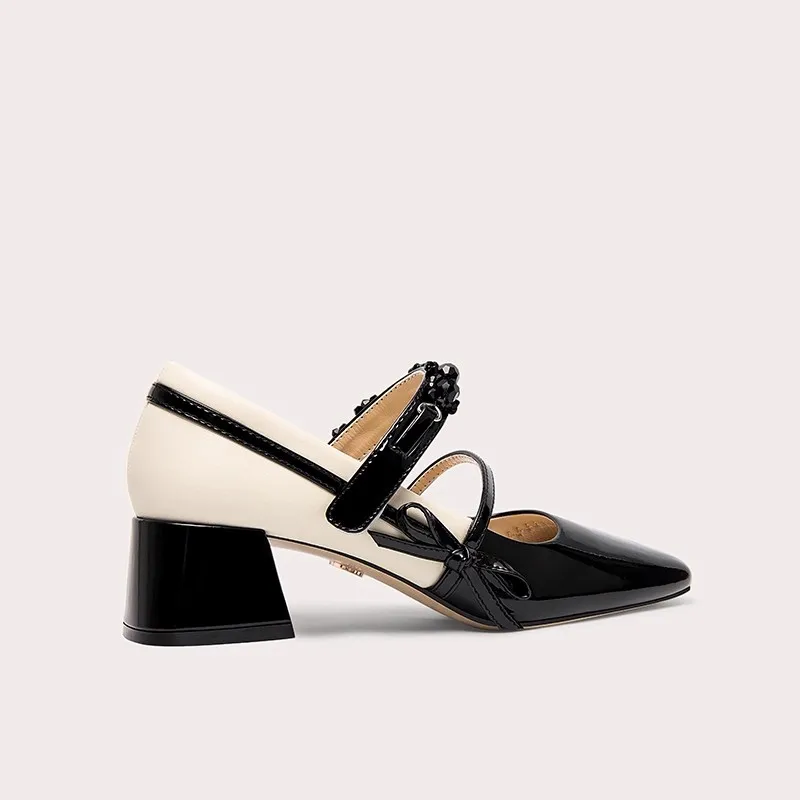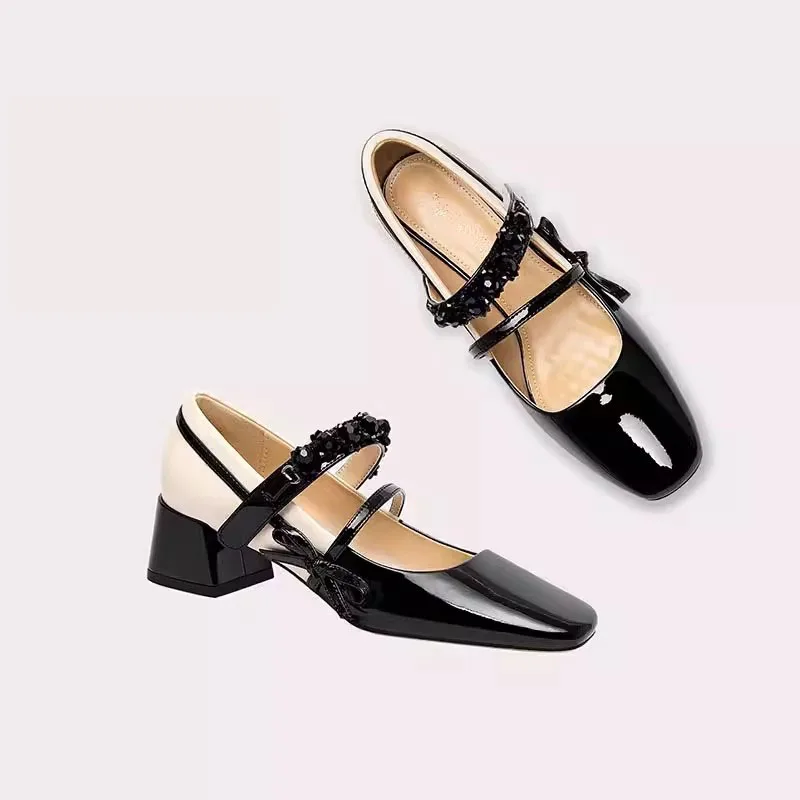 Square Toe Mary Jane Shoes for Women Classic Bow Embellished Double Strap Block Heel Pumps Color-matched Elegant Ankle Boots