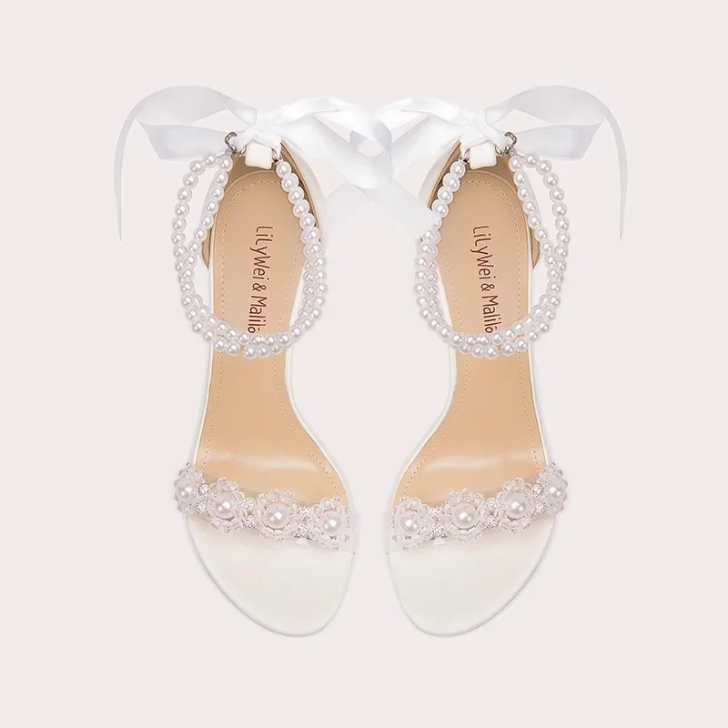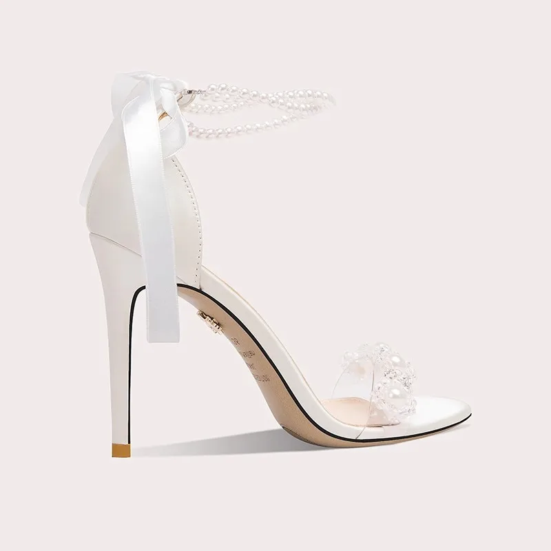 New Women's Pure Color Banquet White Low-cut Buckle Bowknot Open-toe Sandals Stiletto Bridal Women Wedding Shoes