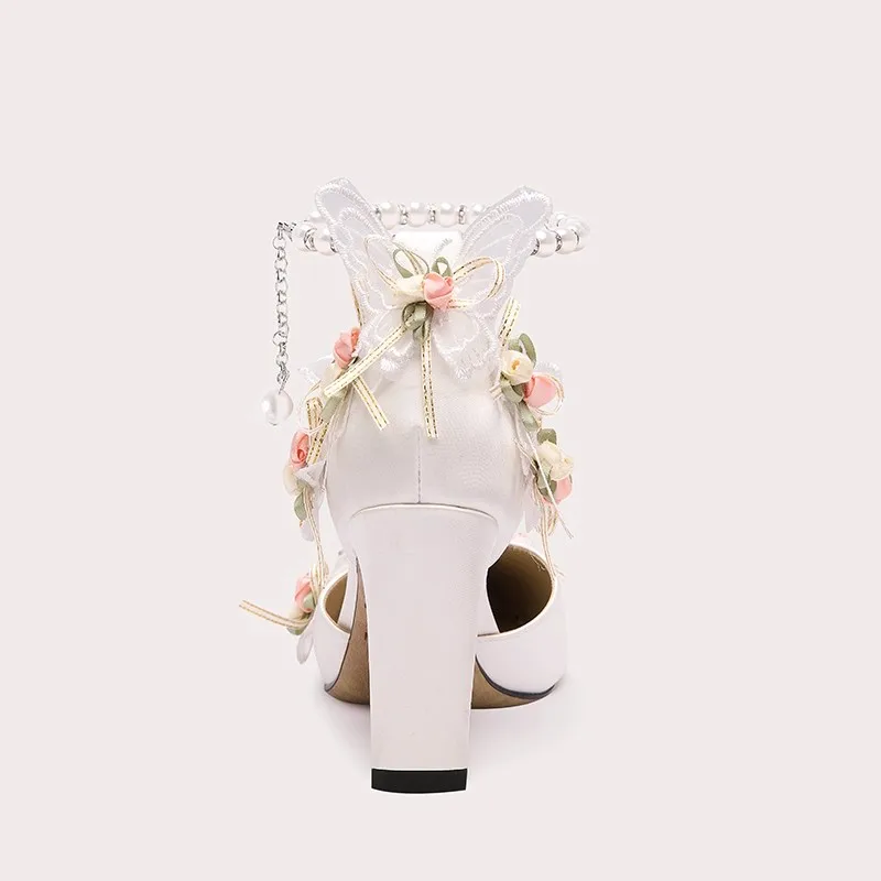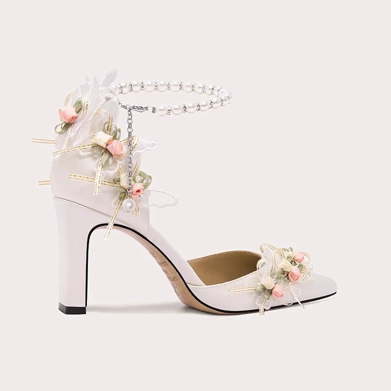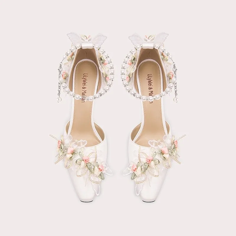 Lily Wei Luxury Floral Bride Shoe High Quality Ankle Pearls Strappy Shoes for Wedding Custom Bride Shoes