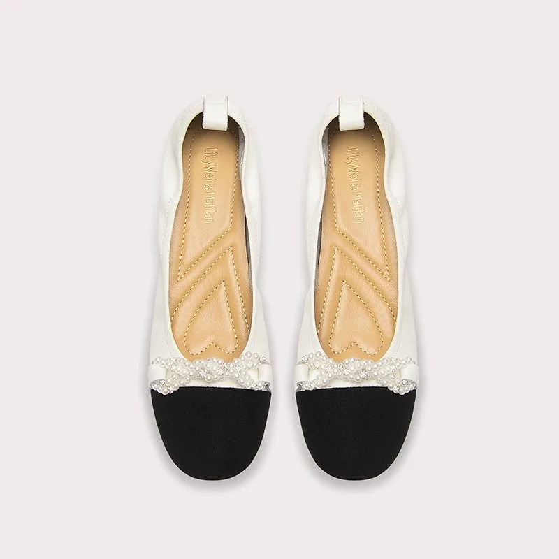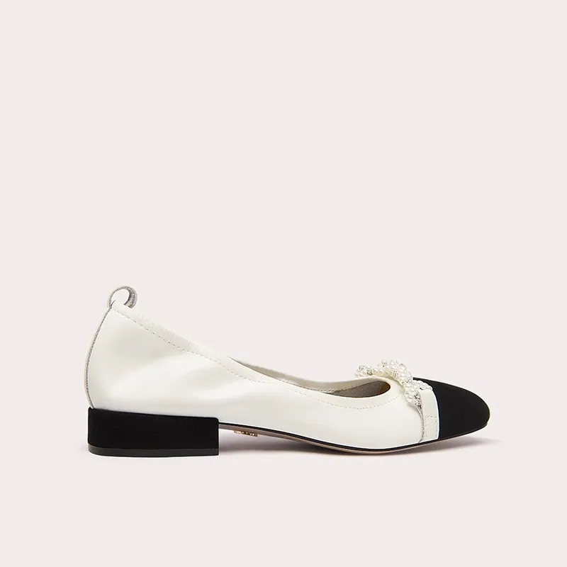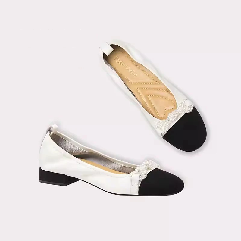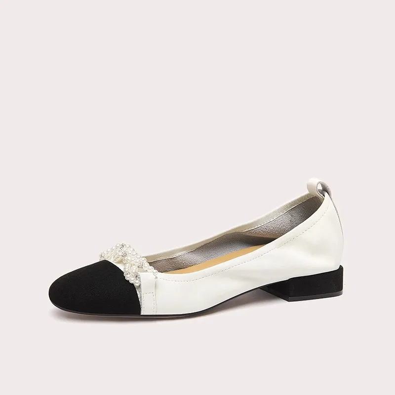 Women's Comfortable French Shoes New Fashionable Round Toe Shallow Mouth Pearl Thick Heel for Autumn