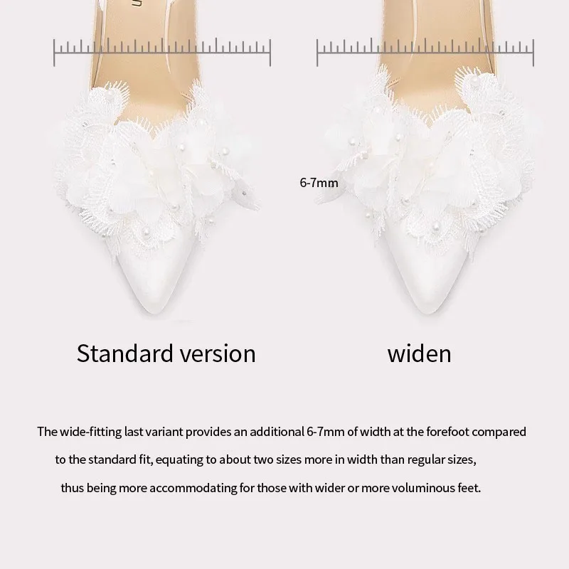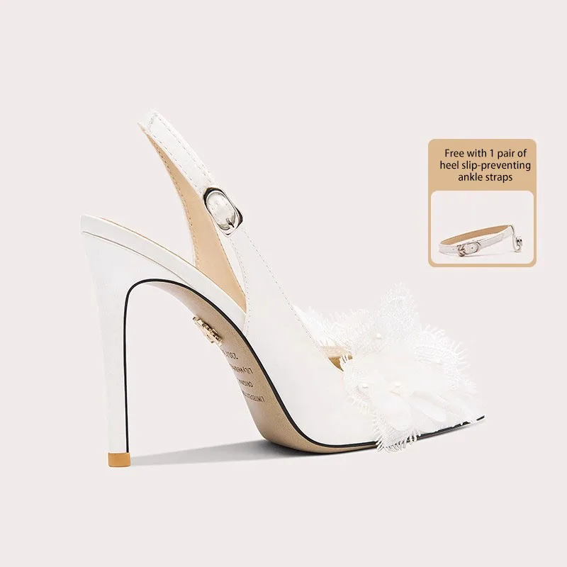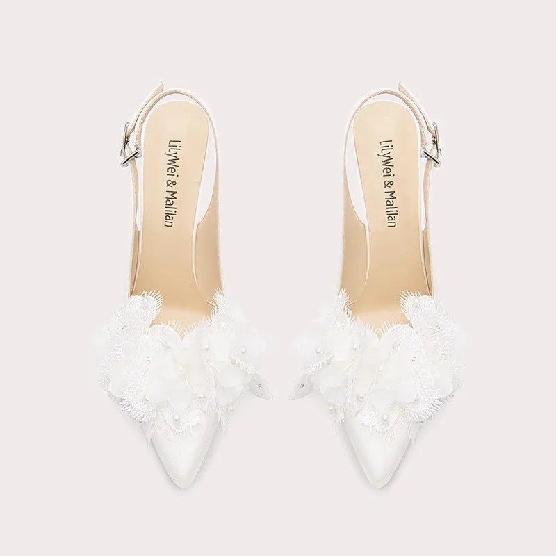 Lily Wei Women's Elegant White Lace Dress Shoes Ankle Strap Button Hard-Wearing Stiletto Pointed Toe