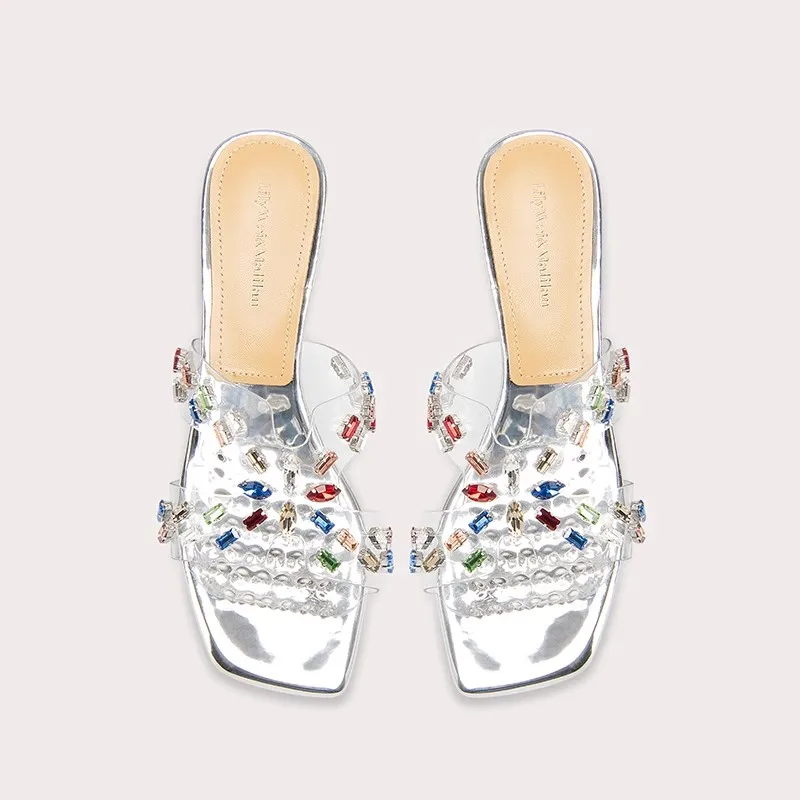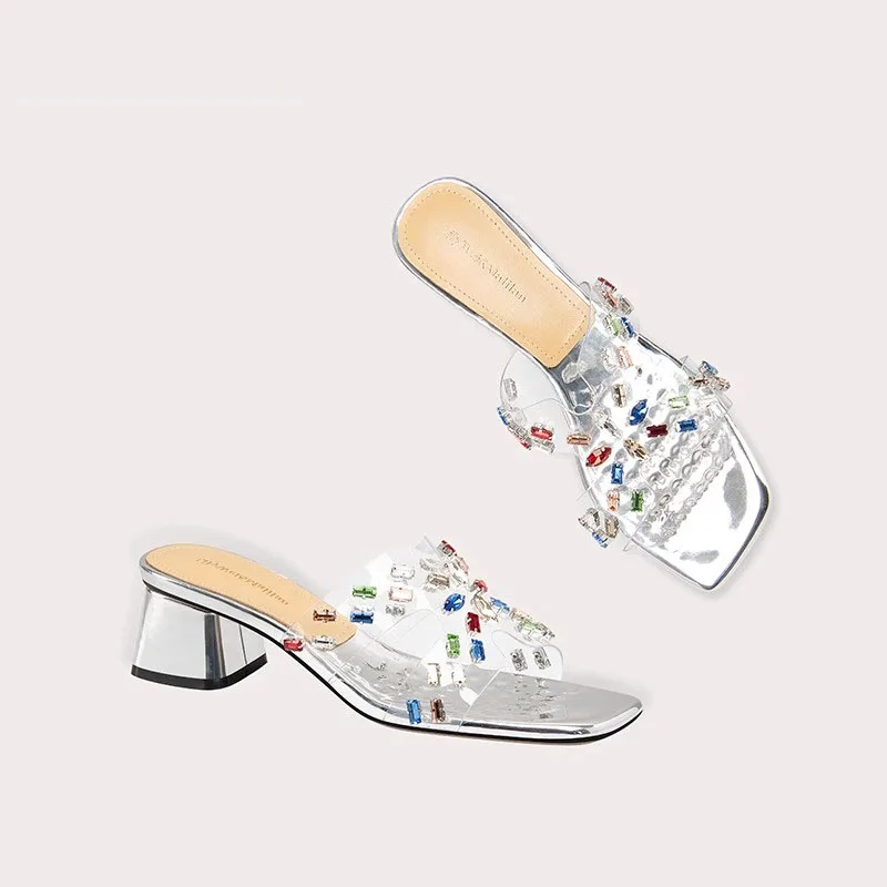 Lily Wei Women's Large Size Square Toe Sandals Transparent High-Heeled Shoes for Summer Temperament Thick Heel